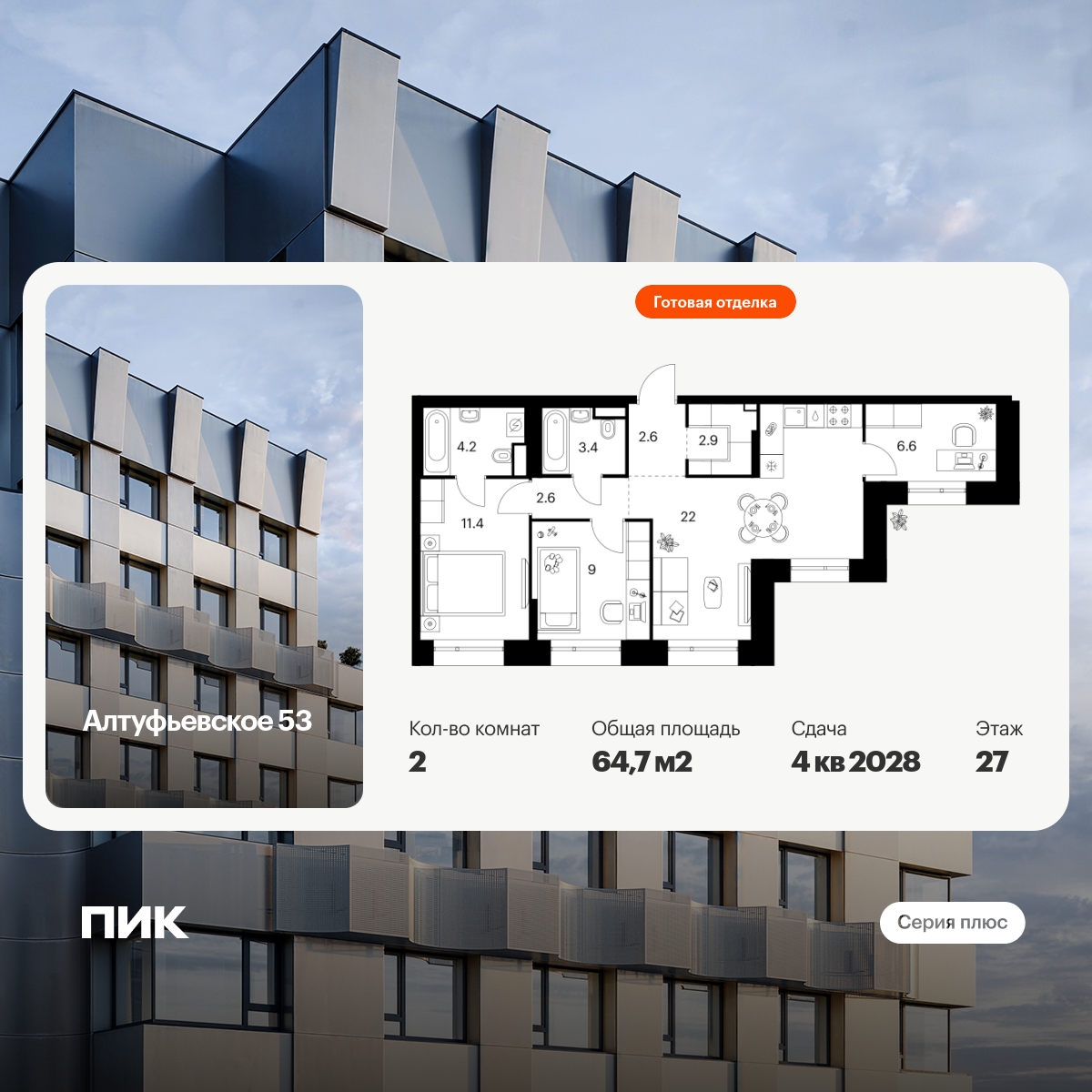 Продаётся 2-комн.квартира площадью 64.70 кв.м на 27 этаже 32 этажного дома (Корпус 1.1, секция 4) проекта ПИК Алтуфьевское 53. Светлый просторный подъезд на уровне земли, функциональная планировка, большие окна, с отделкой.
