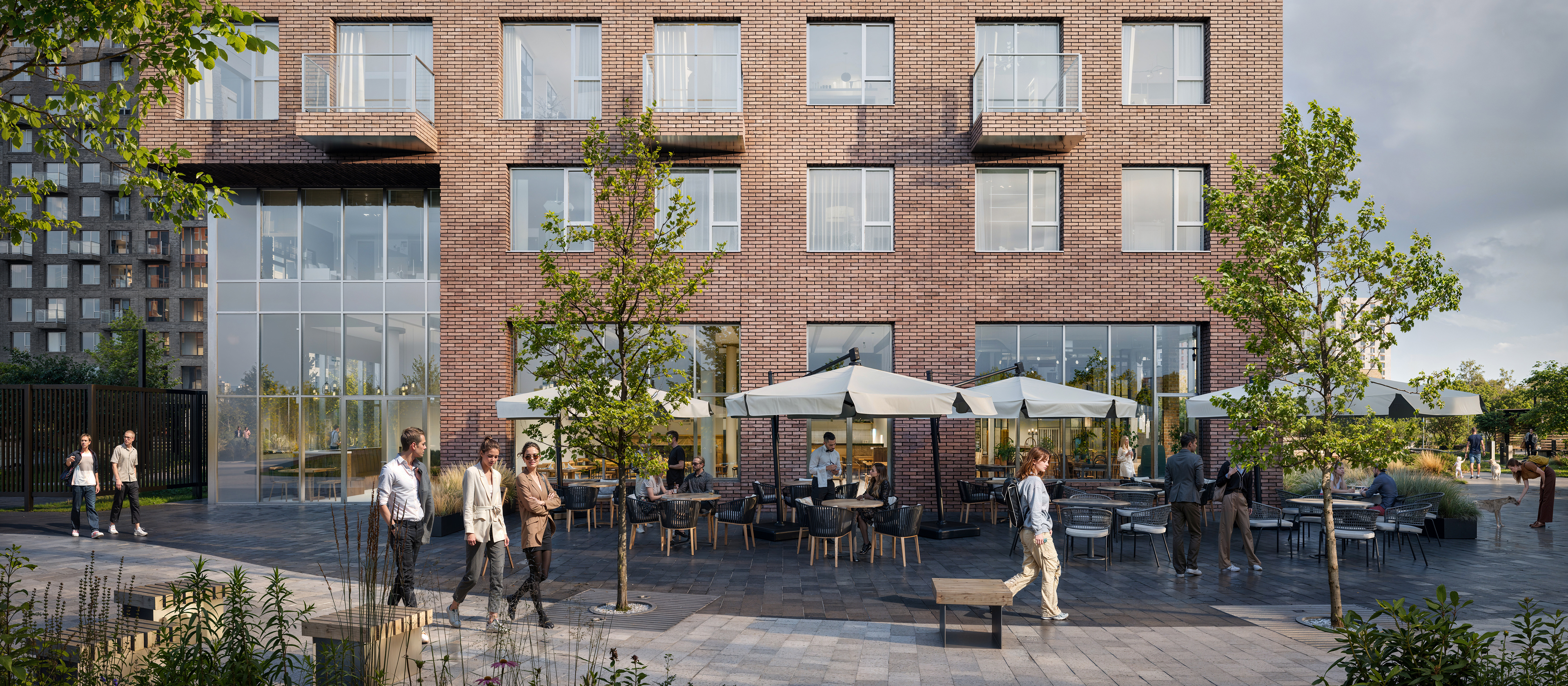 При создании концепции проекта архитекторы бюро КК вдохновились локацией. Природные оттенки и активная пластика корпусов напоминают рельефные выступы на берегу, а окна отражают водную гладь, визуально объединяя дома с природой.