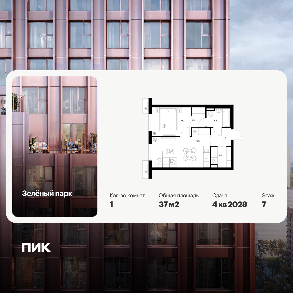 Купить 1к квартиру 37 м² в ЖК Зелёный Парк