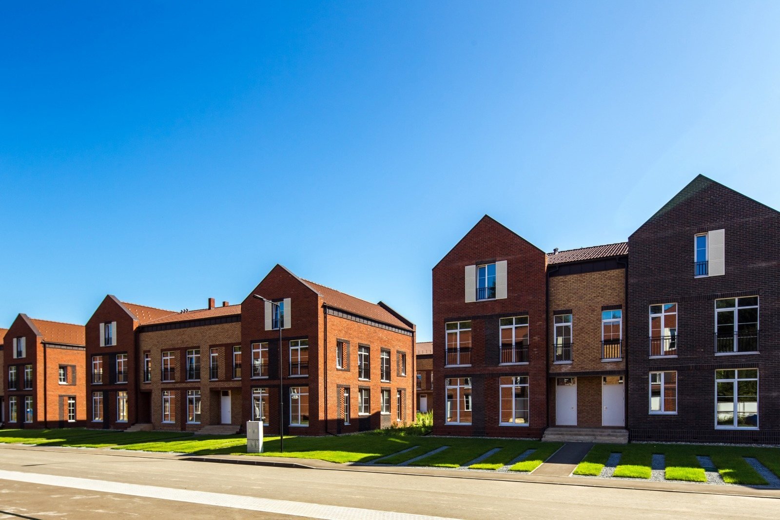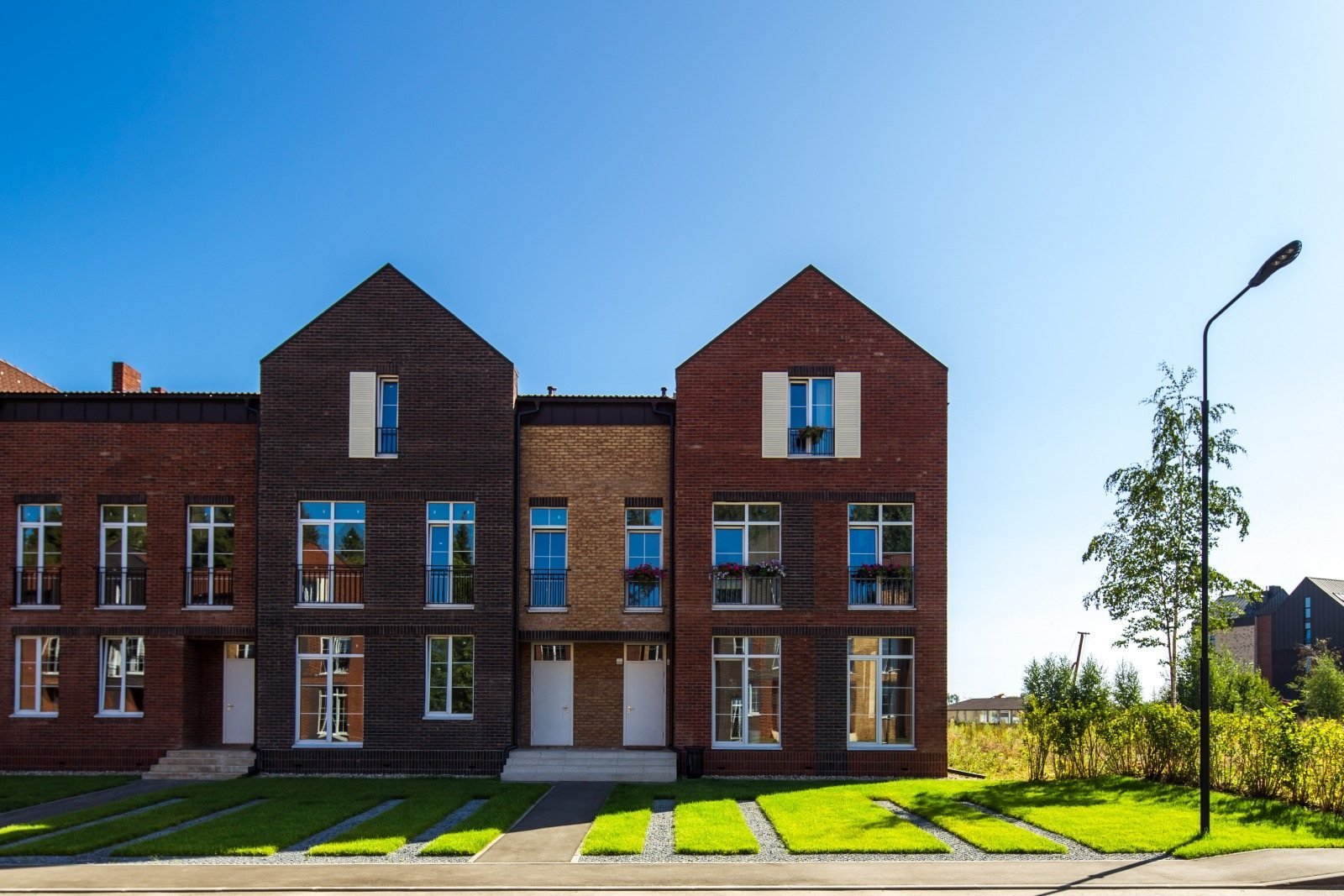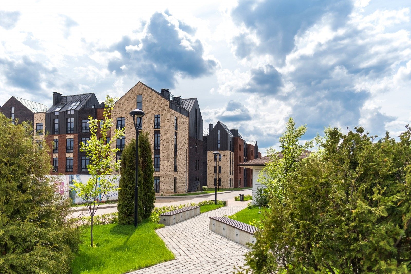 Квартал состоит из разноэтажных домов со ступенчатыми фасадами. Цветовая палитра проекта спокойная: оттенки белого и коричневого сочетаются с пастельным розовым и мятным.