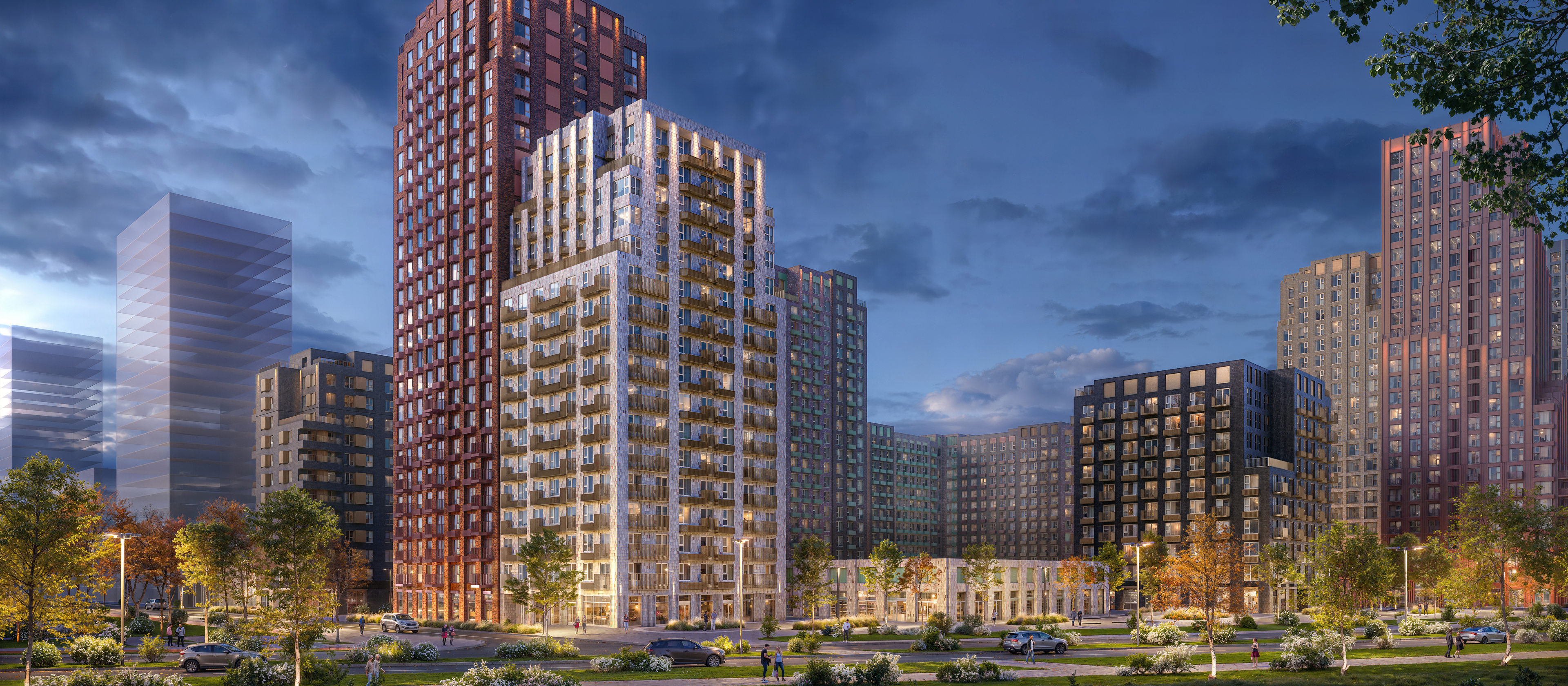 Дизайн проработан и внутри домов. На первых этажах — просторные и светлые лобби: мягкие тона выразительно дополнят контрастные чёрные и терракотовые акценты, а стеклянные двери дарят пространству много естественного света и ощущение простора.