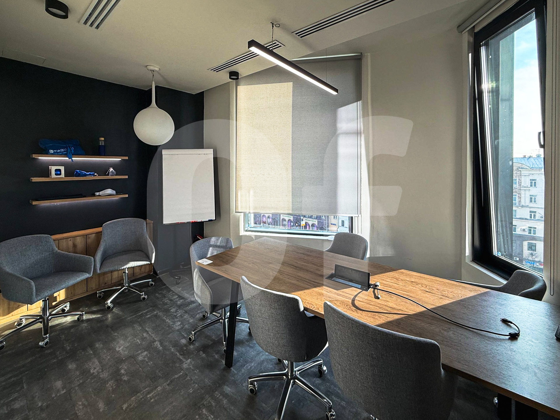 Помещение с функциональной кабинетной планировкой. Переговорная комната, обустроенная кухня, собственный санузел, с мебелью.