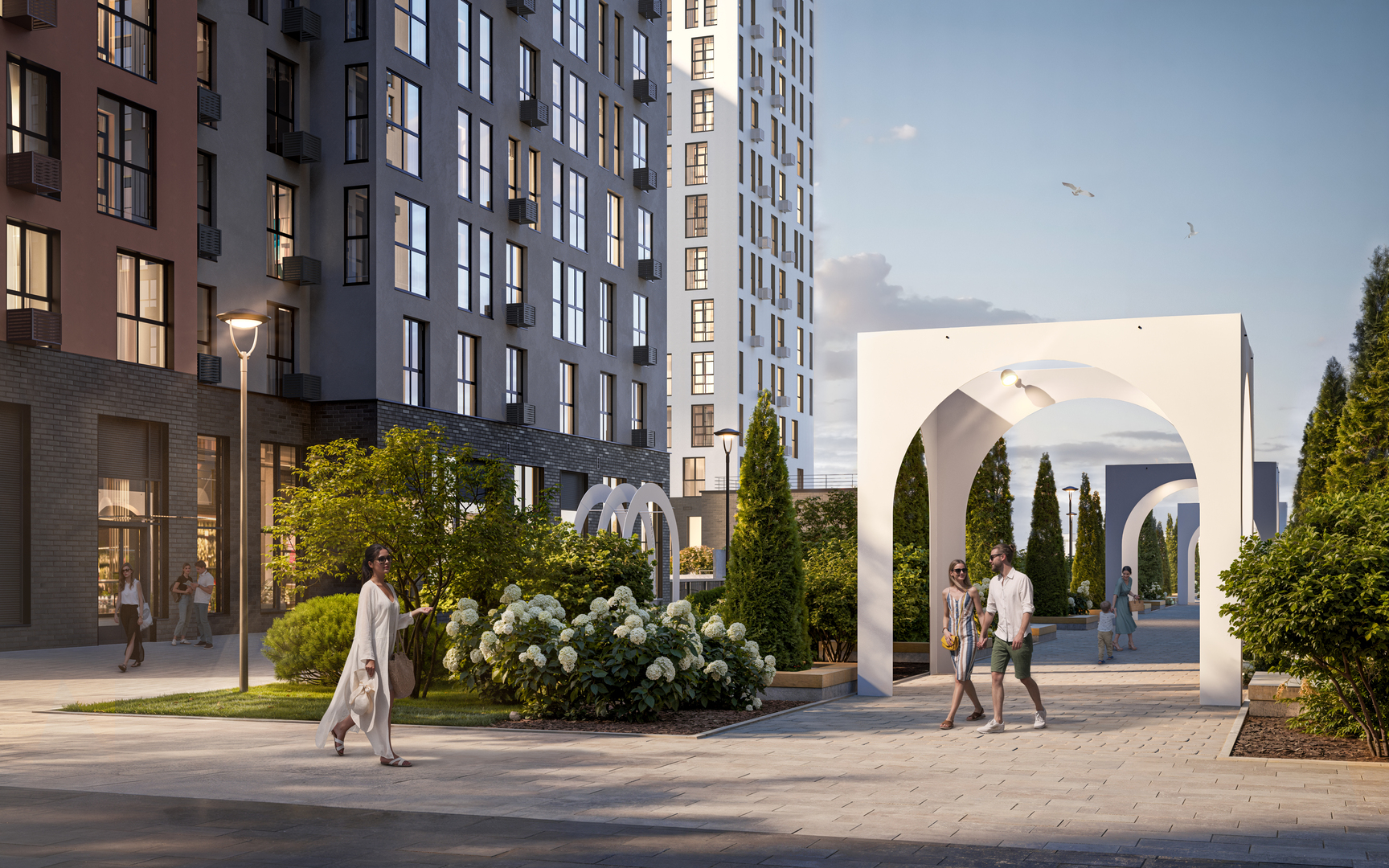 В районе будет реализовано уникальное благоустройство в стилистике средиземноморского сада (концепция архитектурного бюро MAParchitects): собственный парк; фруктовые, декоративные и вечнозелёные деревья, вертикальное озеленение, живые изгороди, кустарники и цветники; амфитеатр; двор-патио с геопластикой; детская площадка с горками и скалодромом. На первых этажах жилых домов откроются магазины, кафе с летними террасами, фитнес-залы, детские развивающие центры, салоны красоты и другие бытовые сервисы.