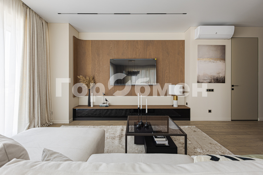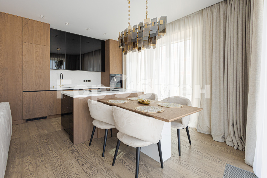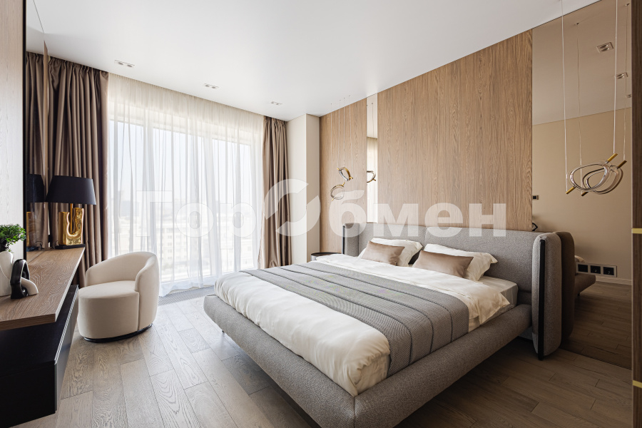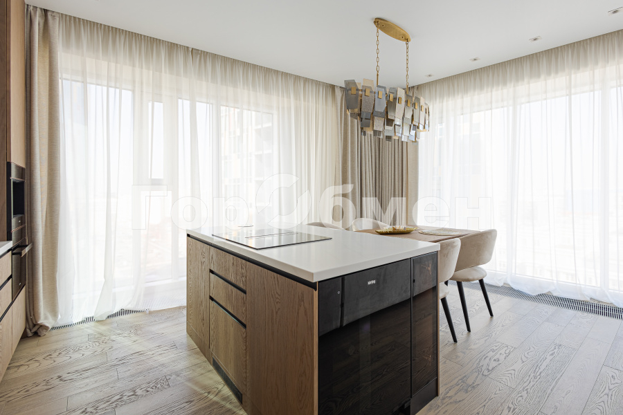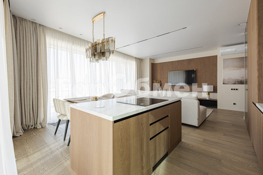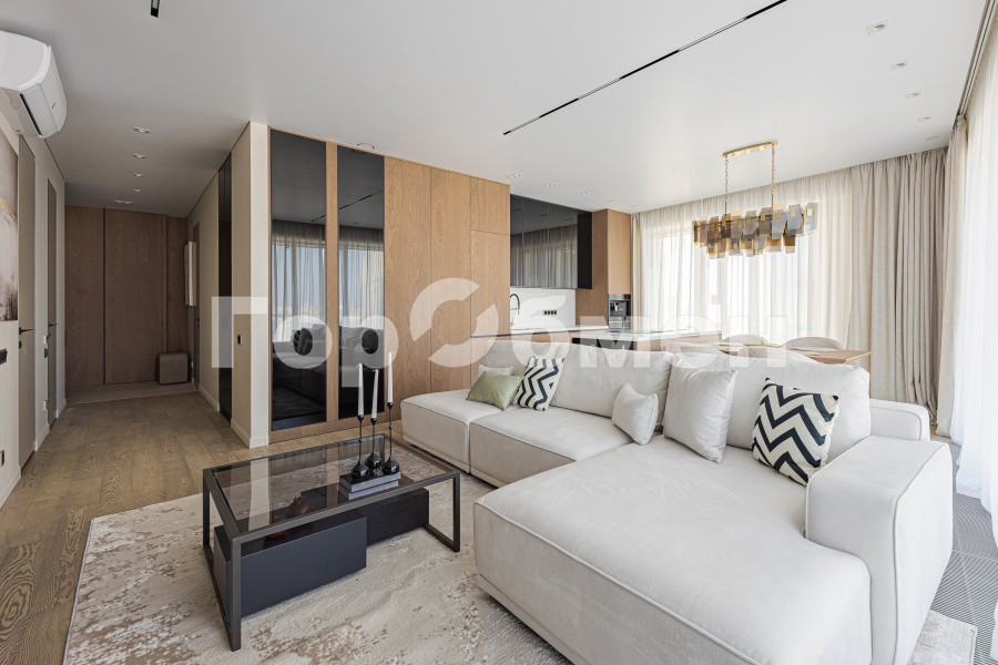 Выполнен дорогой дизайнерский ремонт с использованием натуральных материалов. Премиальная мебель, техника, натуральное дерево, панорамные окна — квартира создаёт ощущение современного городского шика.