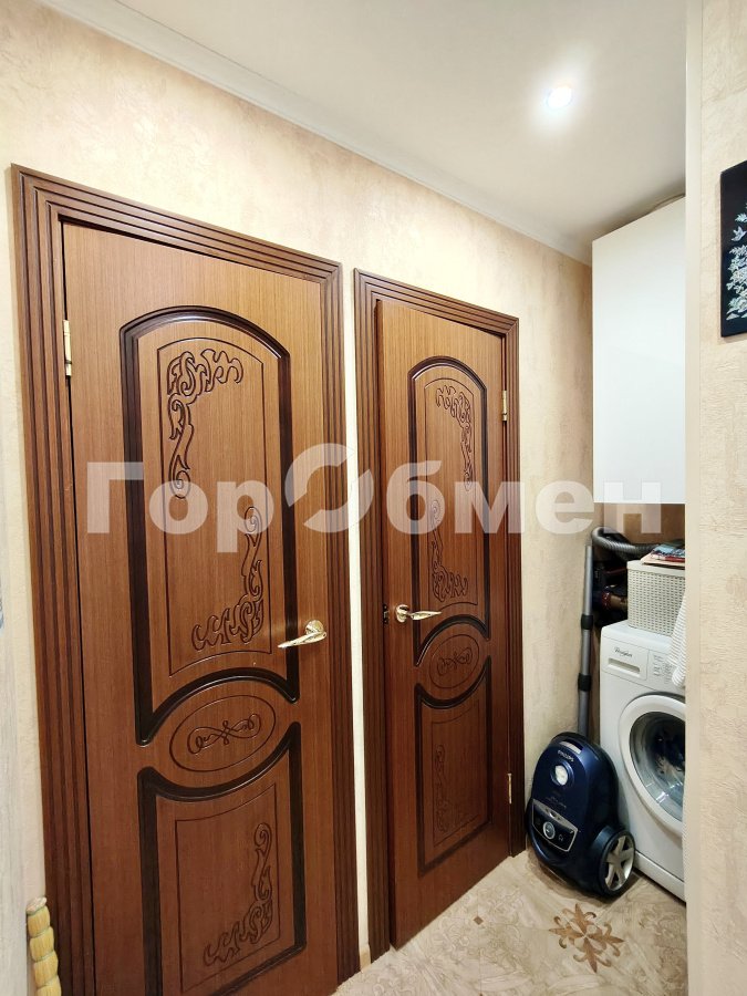 Двухкомнатная квартира с изолированными комнатами. Вход на кухню через маленькую комнату - сделанная перепланировка полностью согласована и зарегистрирована. Благодаря перепланировке в коридоре удалось организовать хозяйственный блок со стиральной машиной и навесным шкафом.