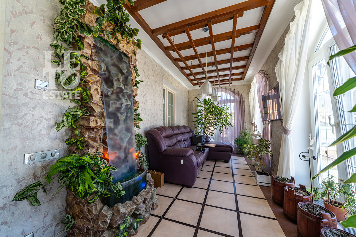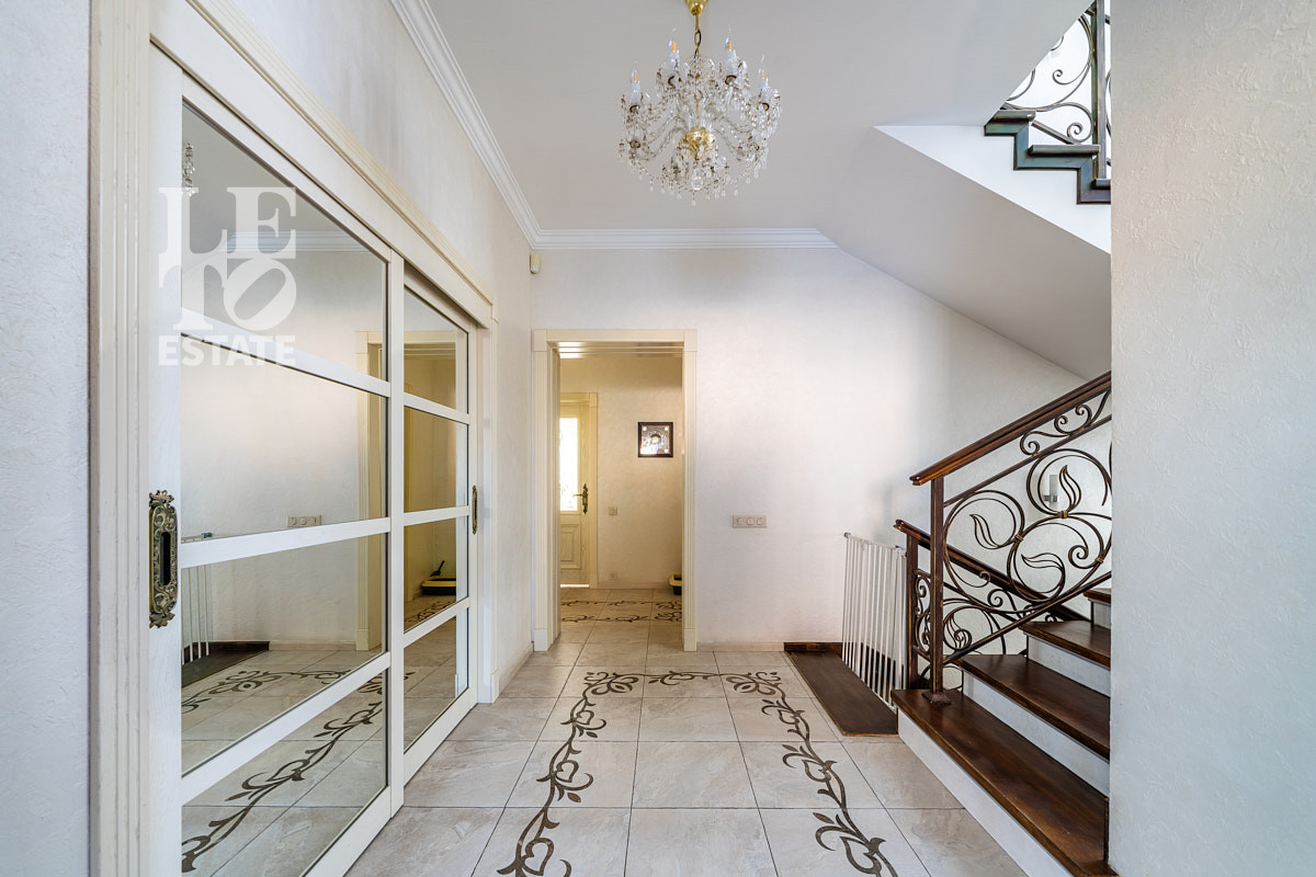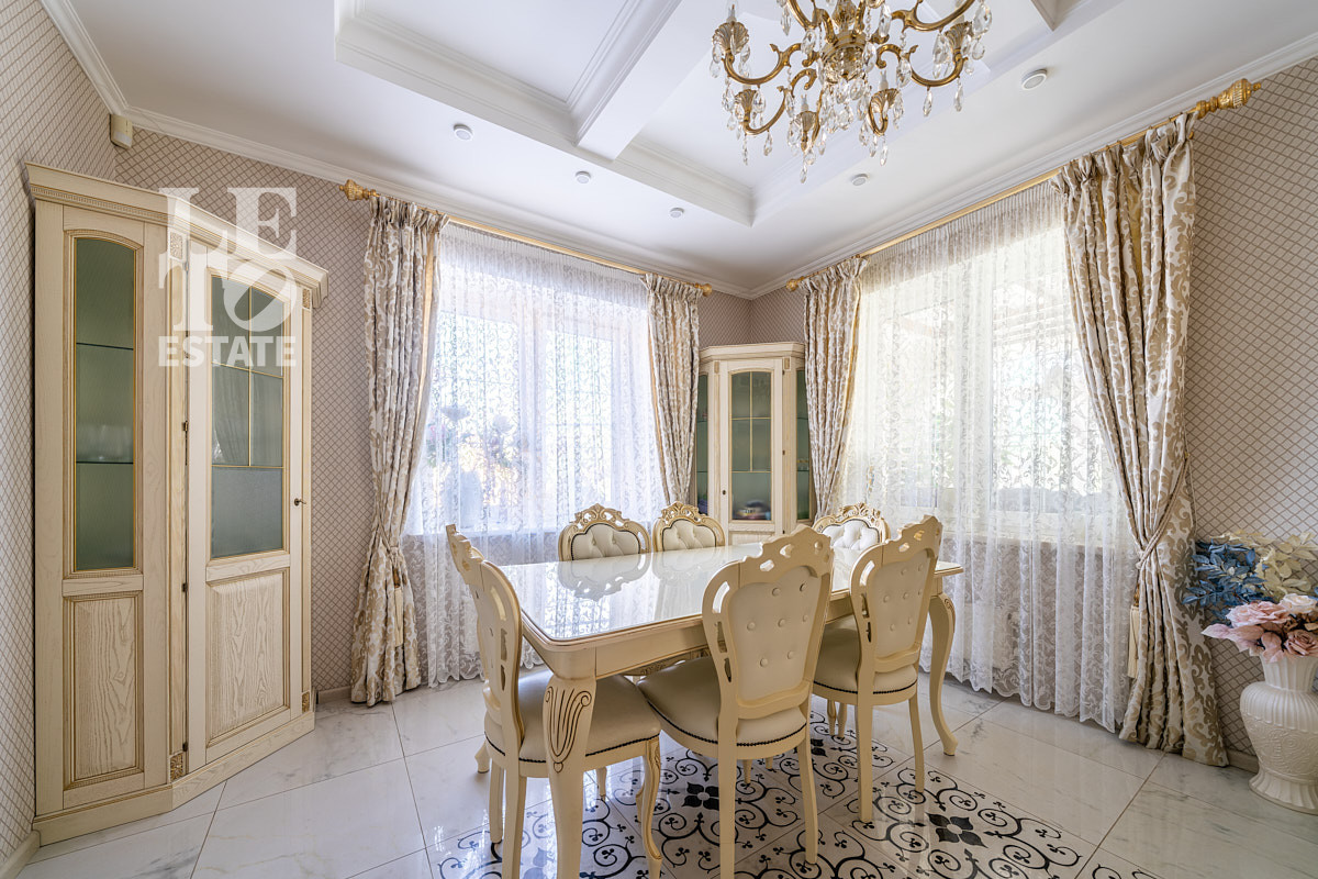 Внутренняя отделка поражает качеством и вниманием к деталям: в гостиной уложен наборный дубовый паркет, в спальнях — благородная дубовая доска, а во всех помещениях с плиткой смонтирована система «теплого пола», обеспечивающая комфортный микроклимат. Центральным украшением гостиной стал дровяной камин, создающий неповторимую атмосферу уюта. Лестница в доме монолитная, отделана дубовой доской, подчеркивающей статусность интерьера. Инженерные системы полностью обновлены: установлены новый котел, а также системы очистки и фильтрации воды.