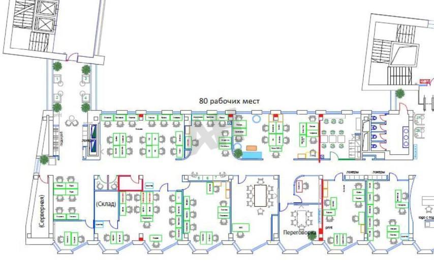 Блок включает в себя кухню, санузлы, серверную комнату и кабинеты различной площади, что позволяет организовать до 80 рабочих мест. Каждое рабочее место оснащено современной слаботочной сетью для подключения телефонии и интернета. Также в помещении предусмотрена мокрая точка.