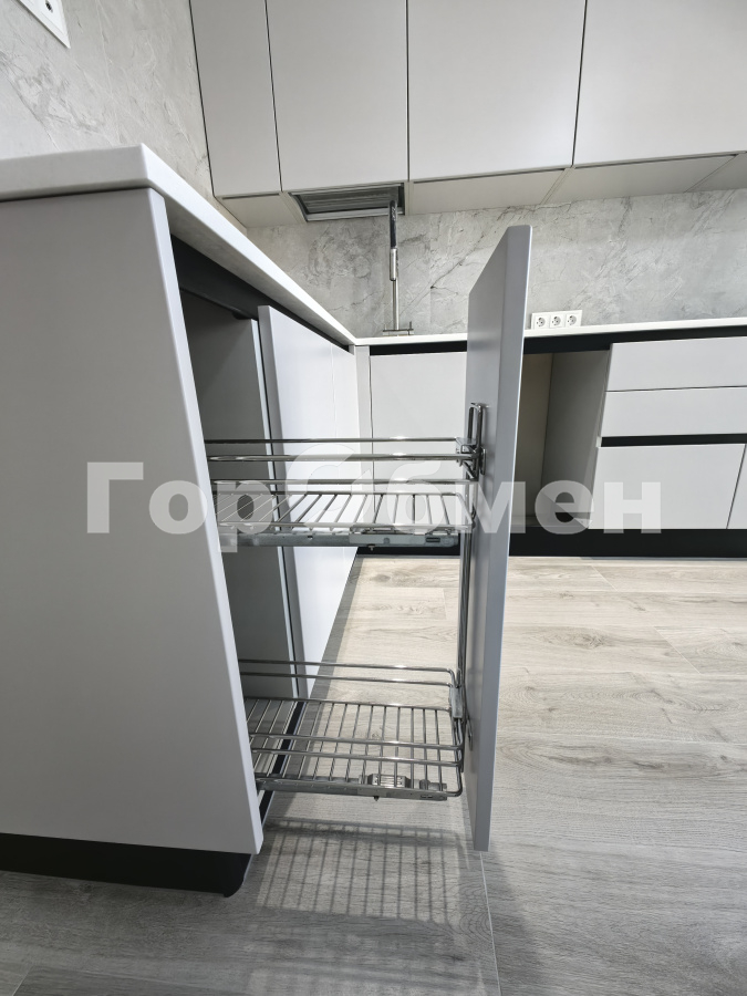 Кухня: эмаль, искусственный камень (столешница), плитка (фартук), камень (мойка). шкафы с доводчиками, предусмотрена подсветка. Панорамное остекленение.