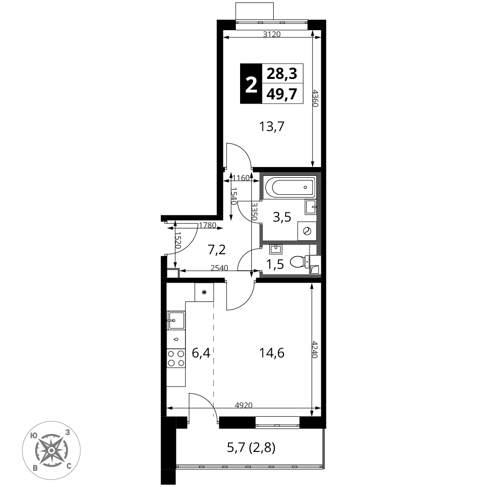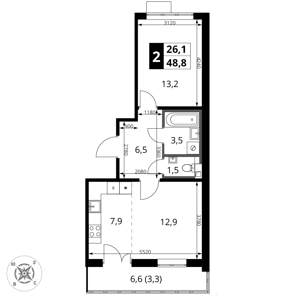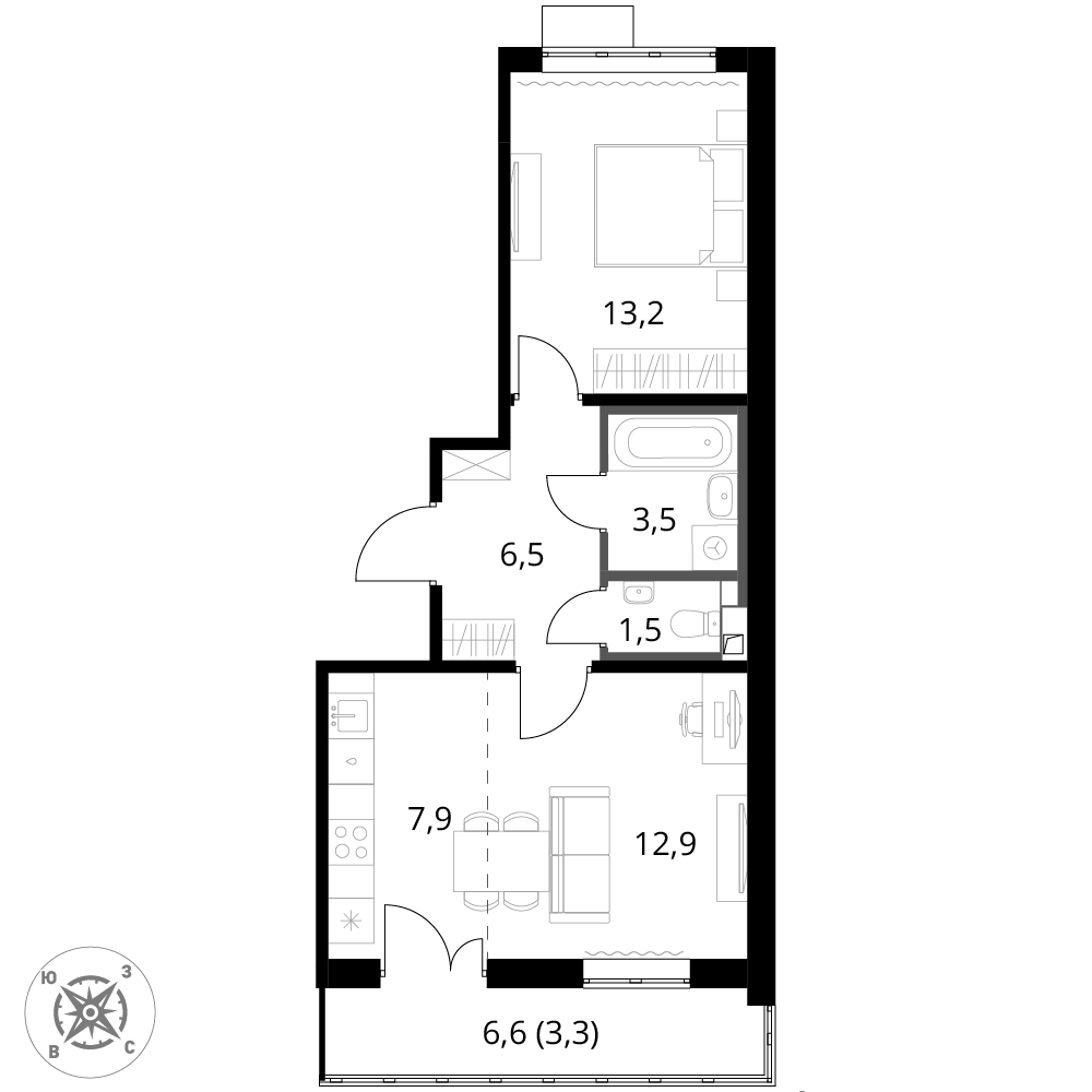 -большой балкон с двумя выходами из комнаты и кухни;