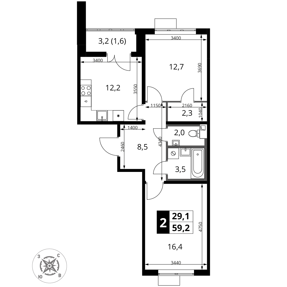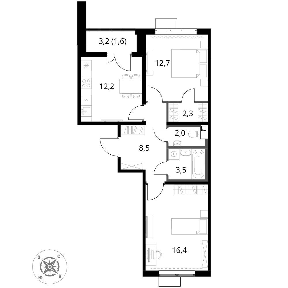 -две светлые и изолированные комнаты 11.5 кв м и 16.2 кв м;