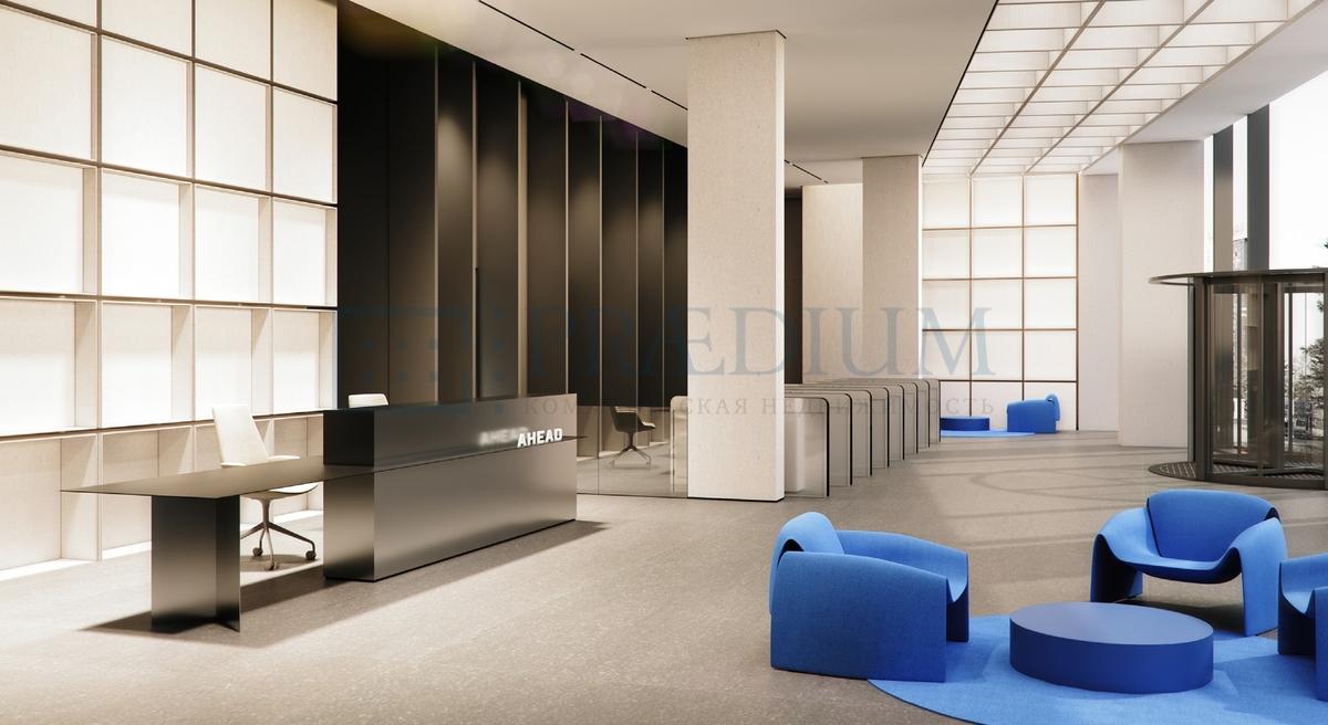Пространства лобби обладают двусветной структурой, площадью до 500 кв. м, высотой потолков 8 м и витражным остеклением, что обеспечивает высокую степень естественного освещения.