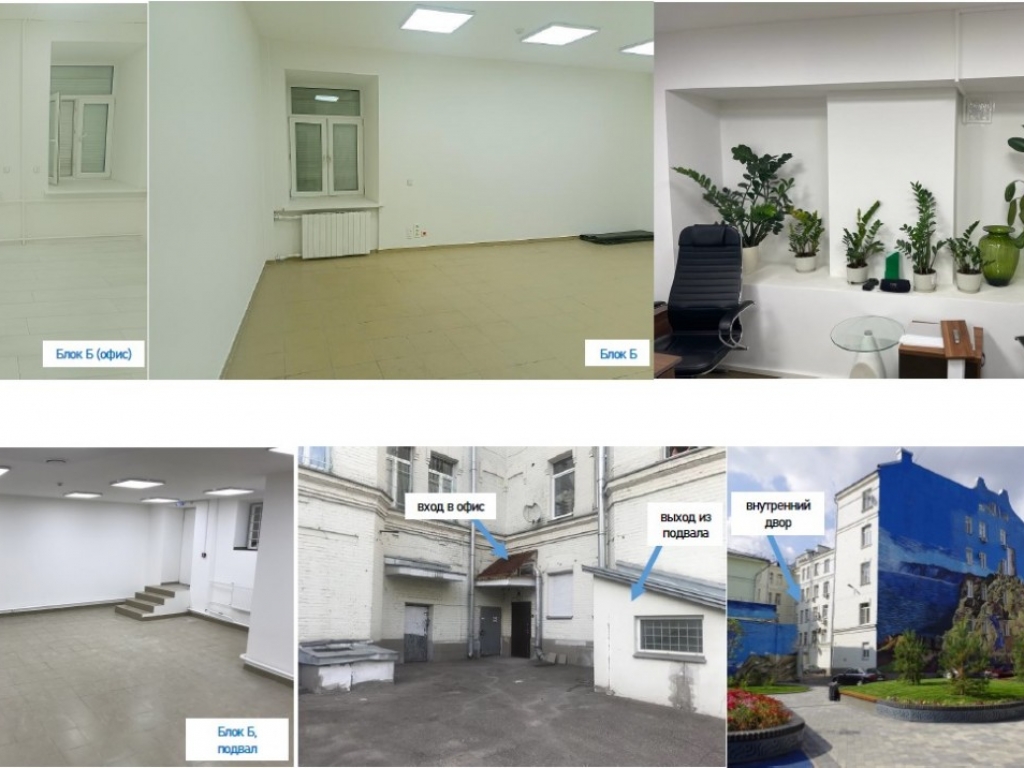 Блок Б представляет собой офисное помещение с отдельным входом со двора, площадью 121,5 кв. м в двух уровнях: 2 кабинета и тамбур на 1 этаже (58,6 м2) и подвал 62,9 кв. м с окнами в приямках, потолки 2,6 м, подвал также имеет независимый выход на улицу, санузел. Удобный внутренний двор, въезд через шлагбаум, бесплатная парковка во дворе