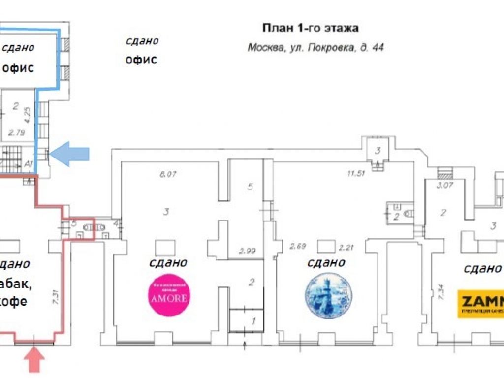 Блок А это магазин 85,1 кв. м с собственным санузлом, витрины, новый ремонт, отдельный вход с Покровки, приточно-вытяжная вентиляция, центральное кондиционирование.