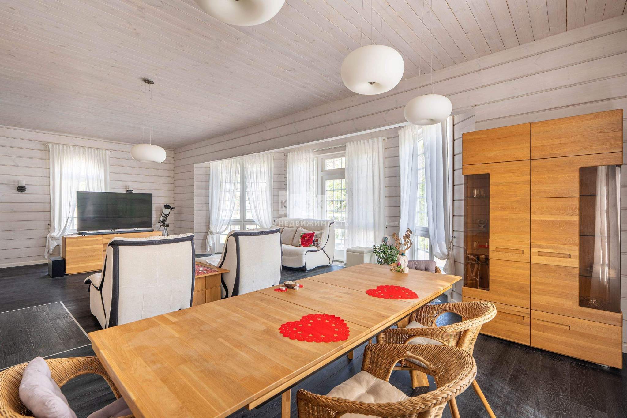 Просторная гостиная с камином и обеденной зоной - идеальное место для семейных вечеров и приема гостей.