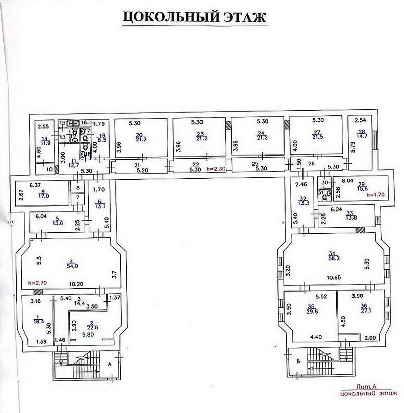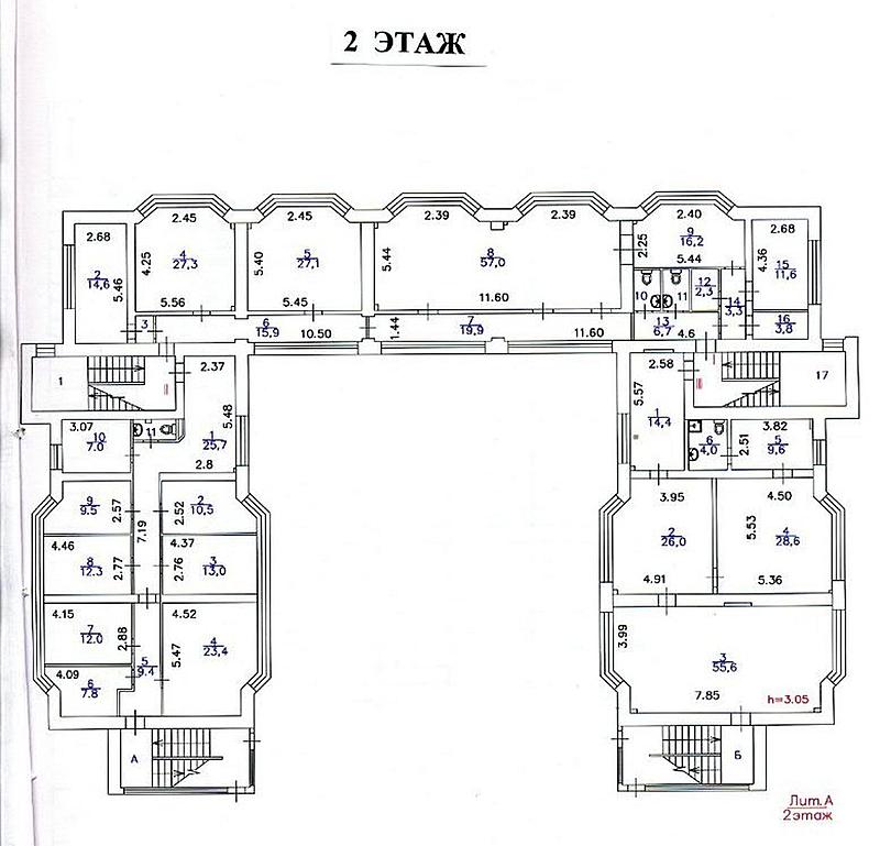 Стандартная кабинетная планировка включает в себя 50 кабинетов, кухню и санузлы.