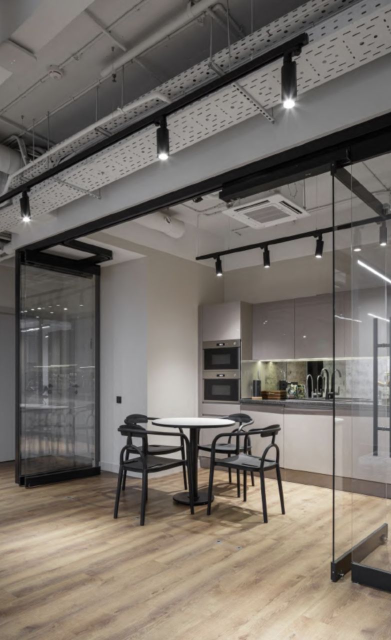 На этаже есть как отдельные кабинеты, так и открытое пространство. Так же есть гардеробная, зона ресепшн и отдыха, сан.узлы, переговорные комнаты, выделенная обеденная зона и кухня.