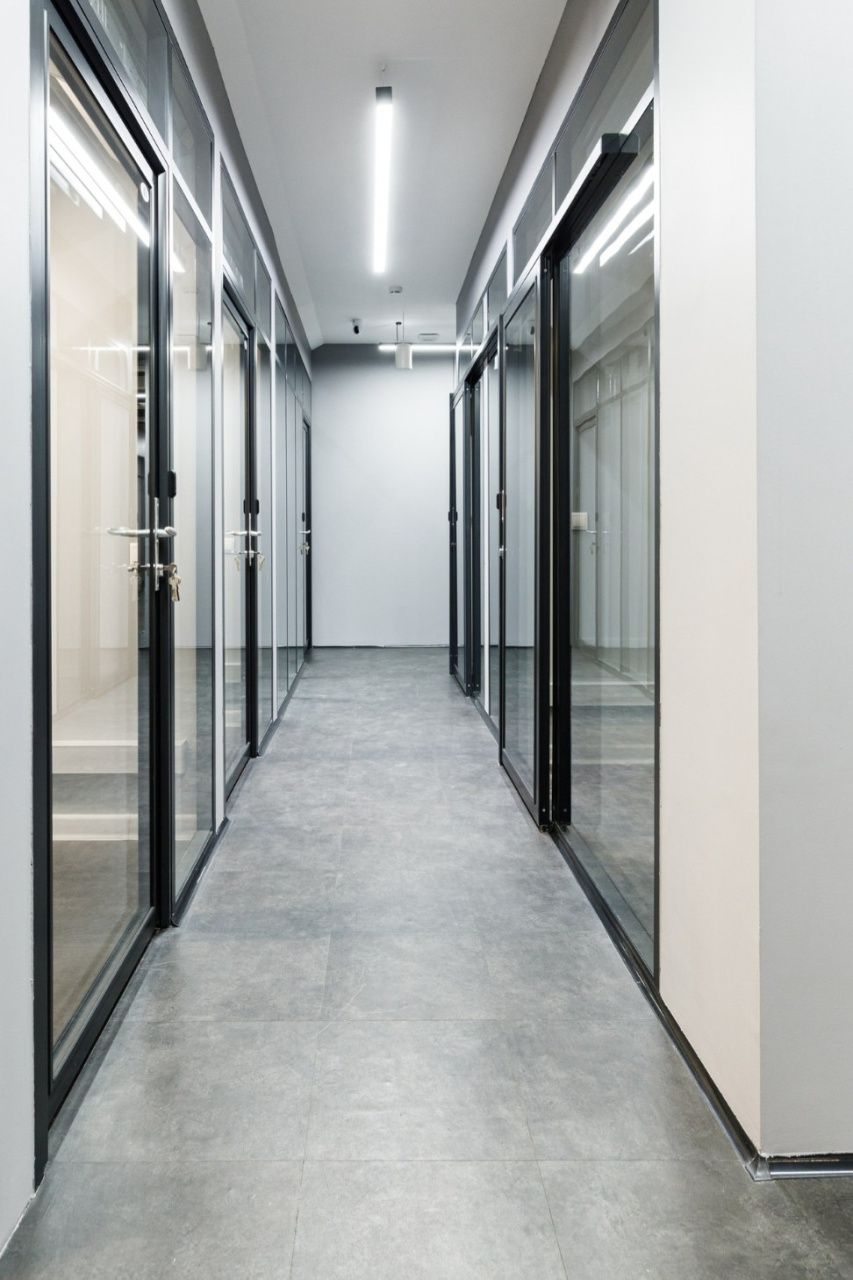 На этаже есть большая рабочая зона open space, отдельные кабинеты, 4 переговорные комнаты, кухня и собственные сан. узлы.