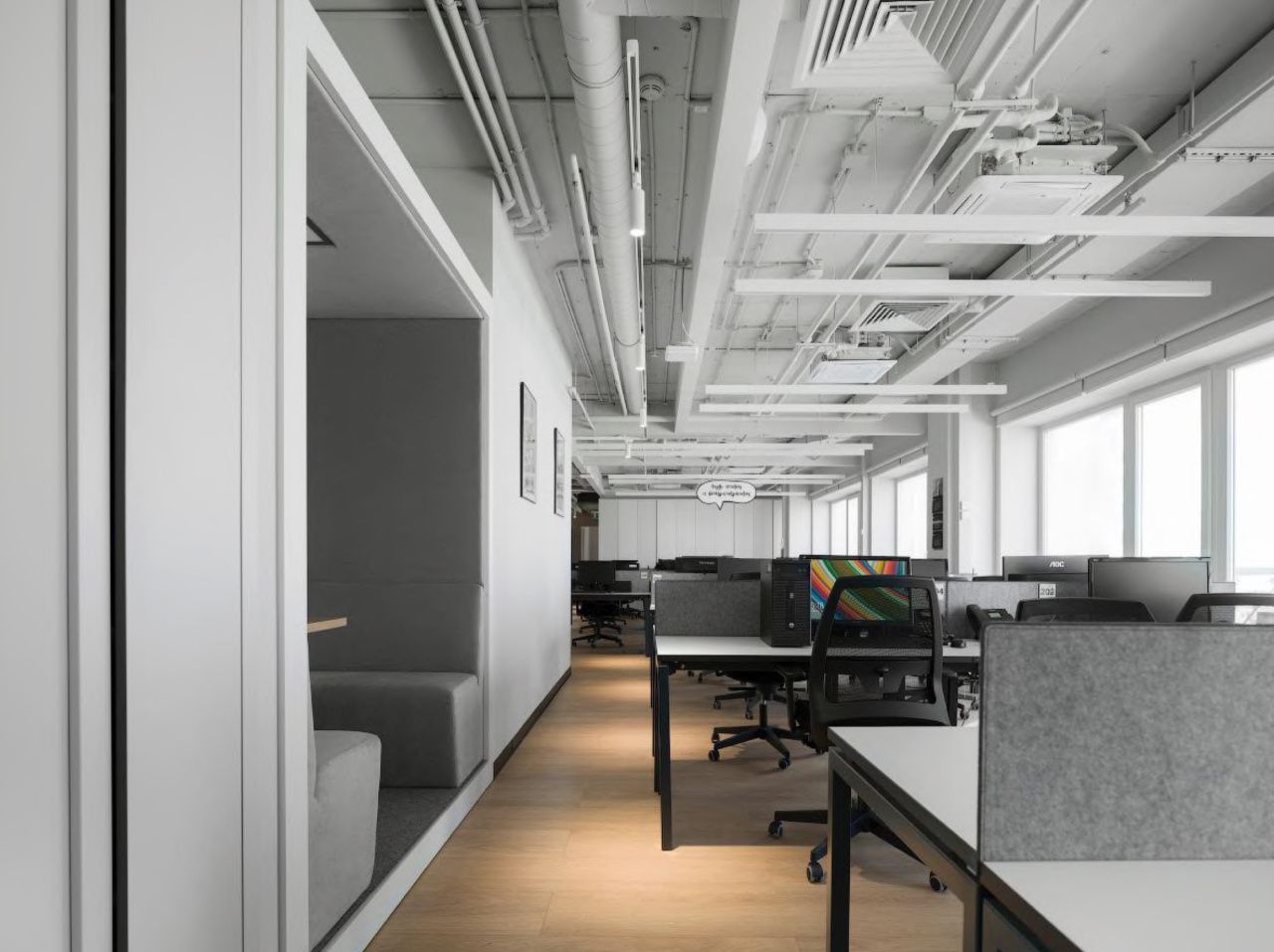 В местах общего пользования есть зона ресепшн, переговорные комнаты, зона отдыха, оборудованная кухня и место приема пищи, санузлы.