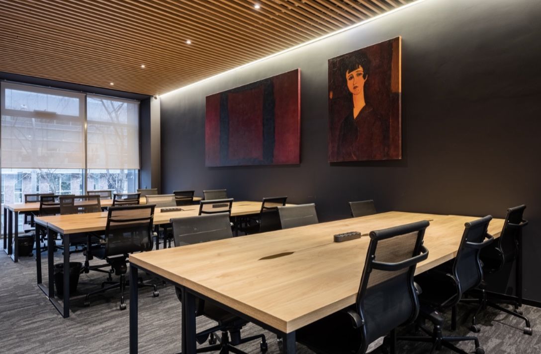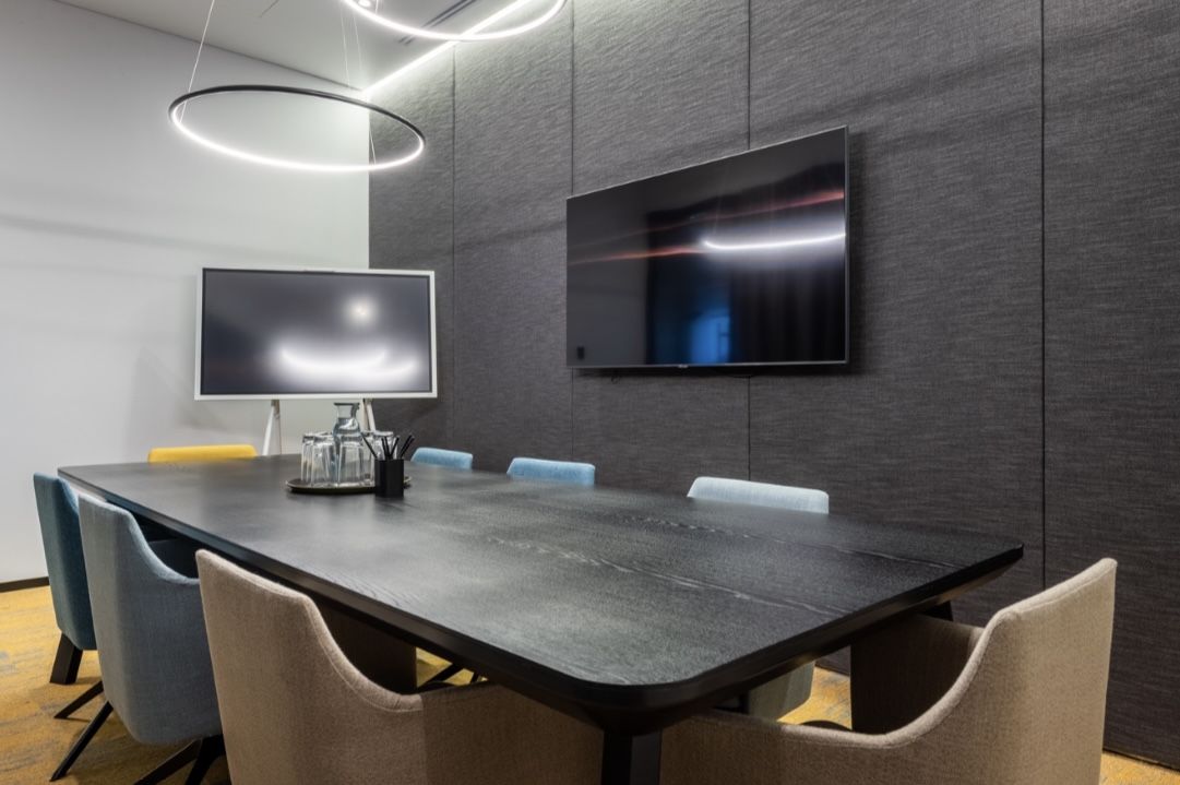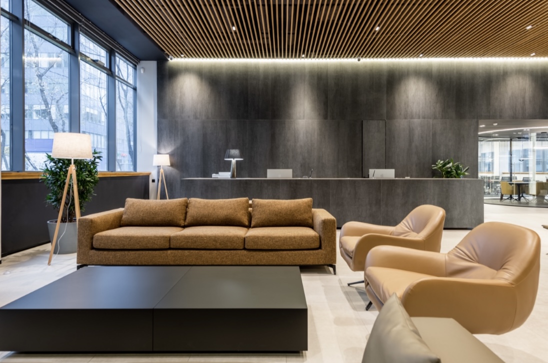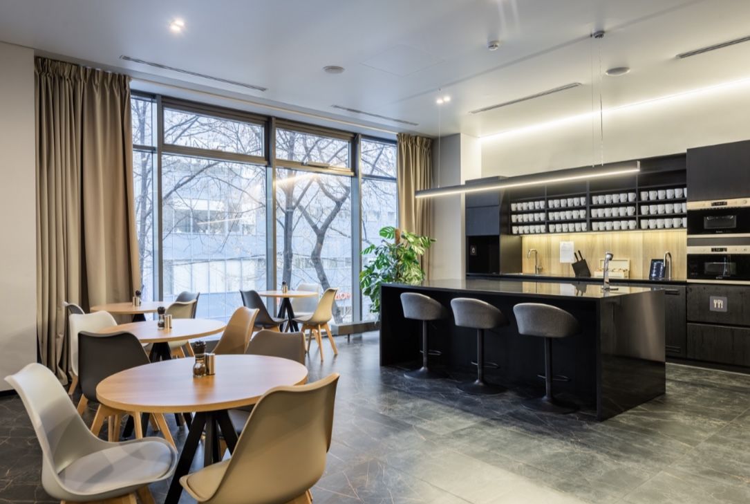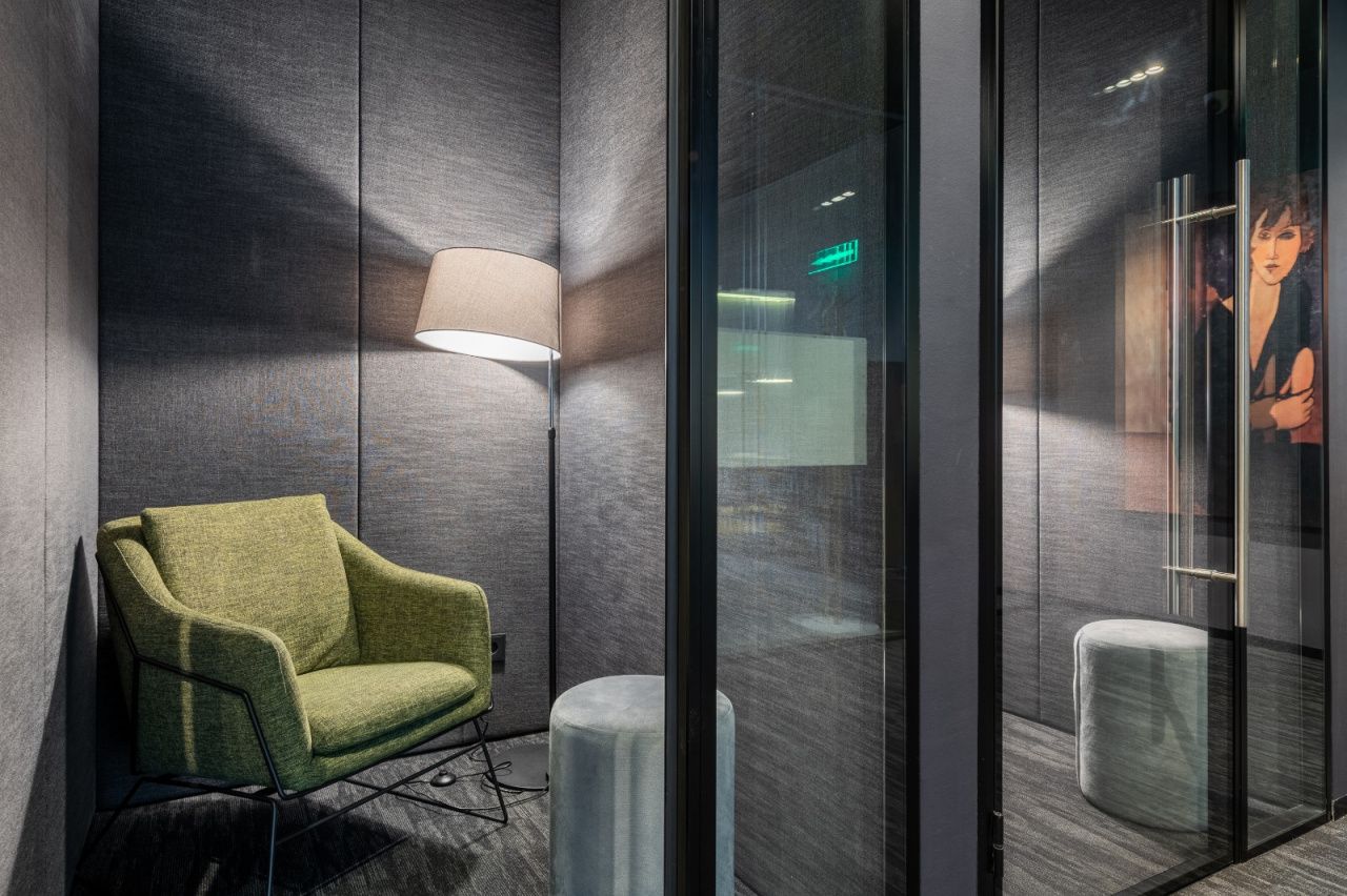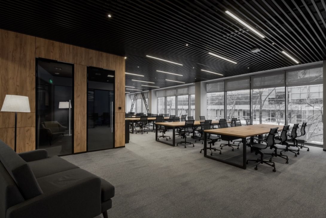 Офис рассчитан на 124 рабочих мест. Так же есть переговорные комнаты, телефонные будки, кухня, санузлы, душевая, лаундж зона.