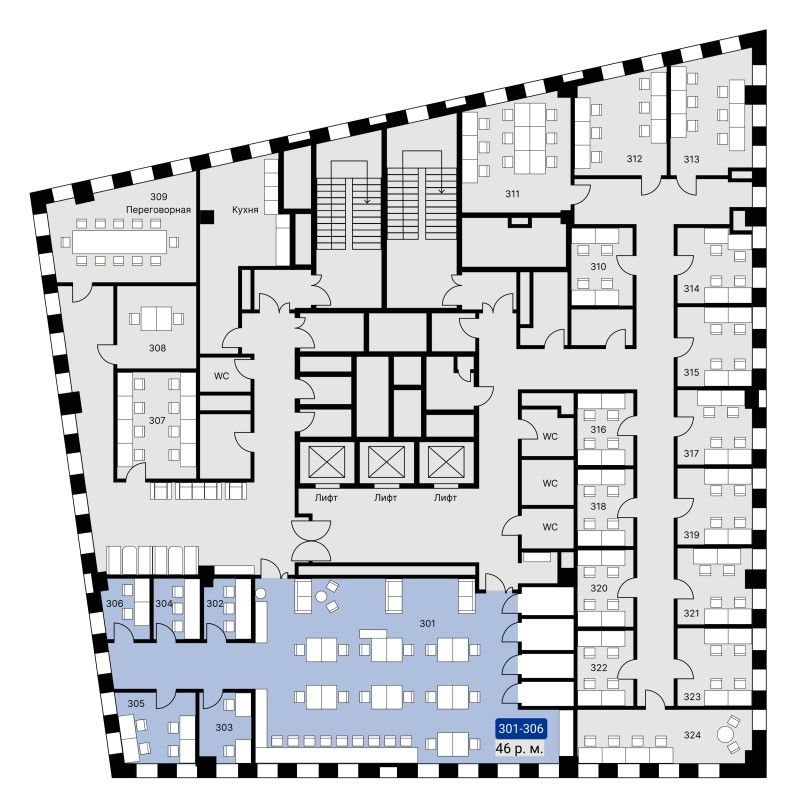 На этаже есть кухня, переговорные комнаты, сан. узлы, принт зона.