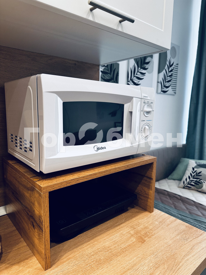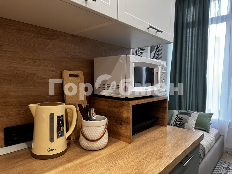входная дверь с зеркалом во весь рост, совмещенный оборудованный санузел, два вместительных шкафа для вещей, удобная кровать, письменный стол, телевизор, кухонная зона с холодильником, стиральной машинкой, свч, настольной электрической плиткой для готовки, чайником и кухонными принадлежностями. Также имеется вместительная антресоль, куда можно положить габаритные вещи.