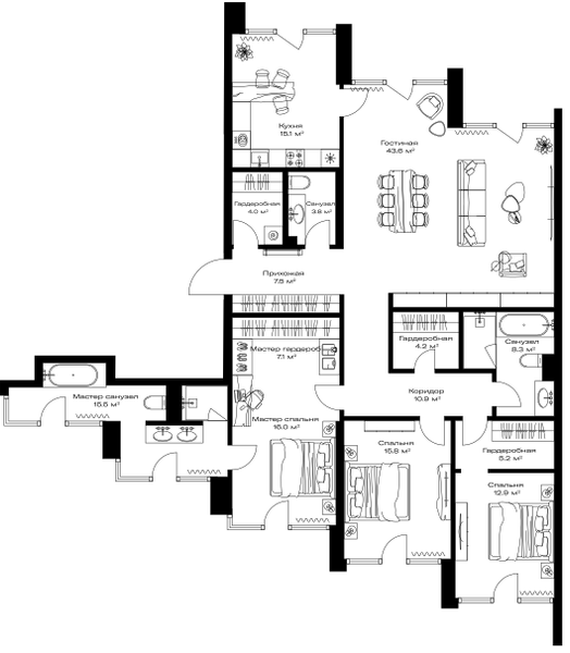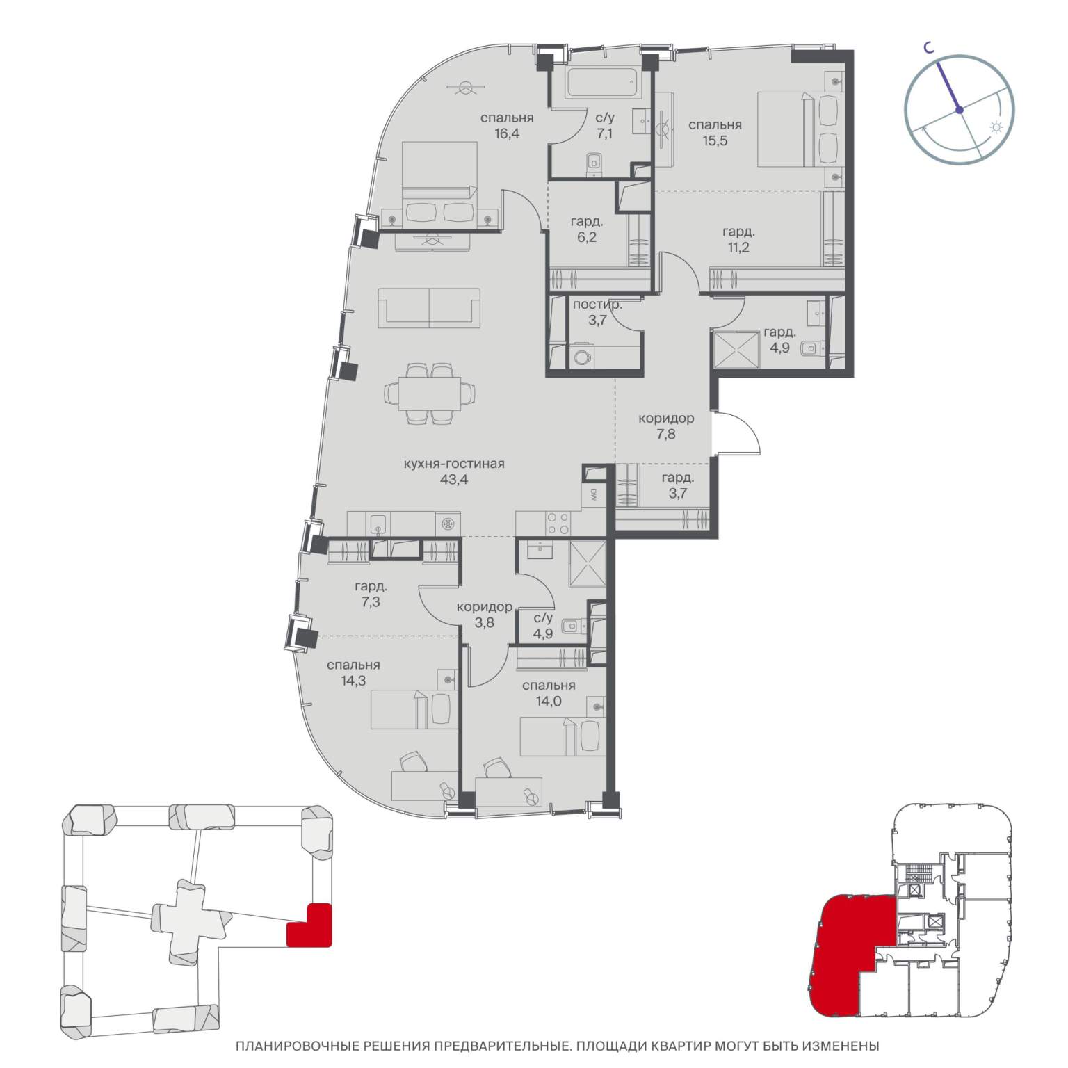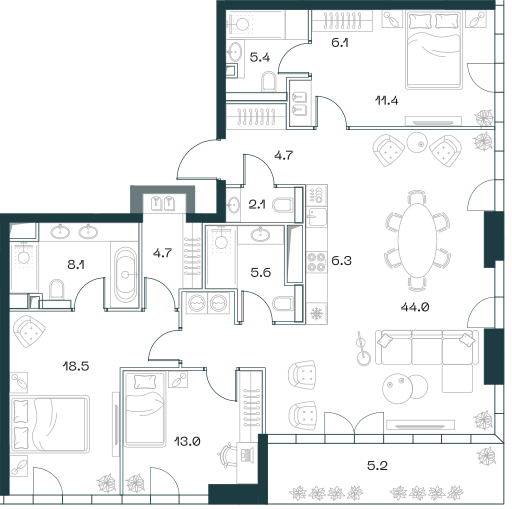 Общая площадь квартиры составляет 183.6 кв. м, из которых 117 кв. м — жилая (комнаты: 18,7+16,4+14,2+21,6+46)/18,4) и 18.6 кв. м — кухня, 3 с/у совмещенных, 2 лоджии.