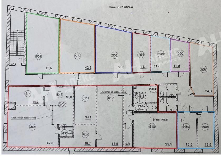 Помещение имеет кабинетную планировку: 2 кабинета. Санузел на этаже. Здание не оборудовано лифтом. На плане номер 508.