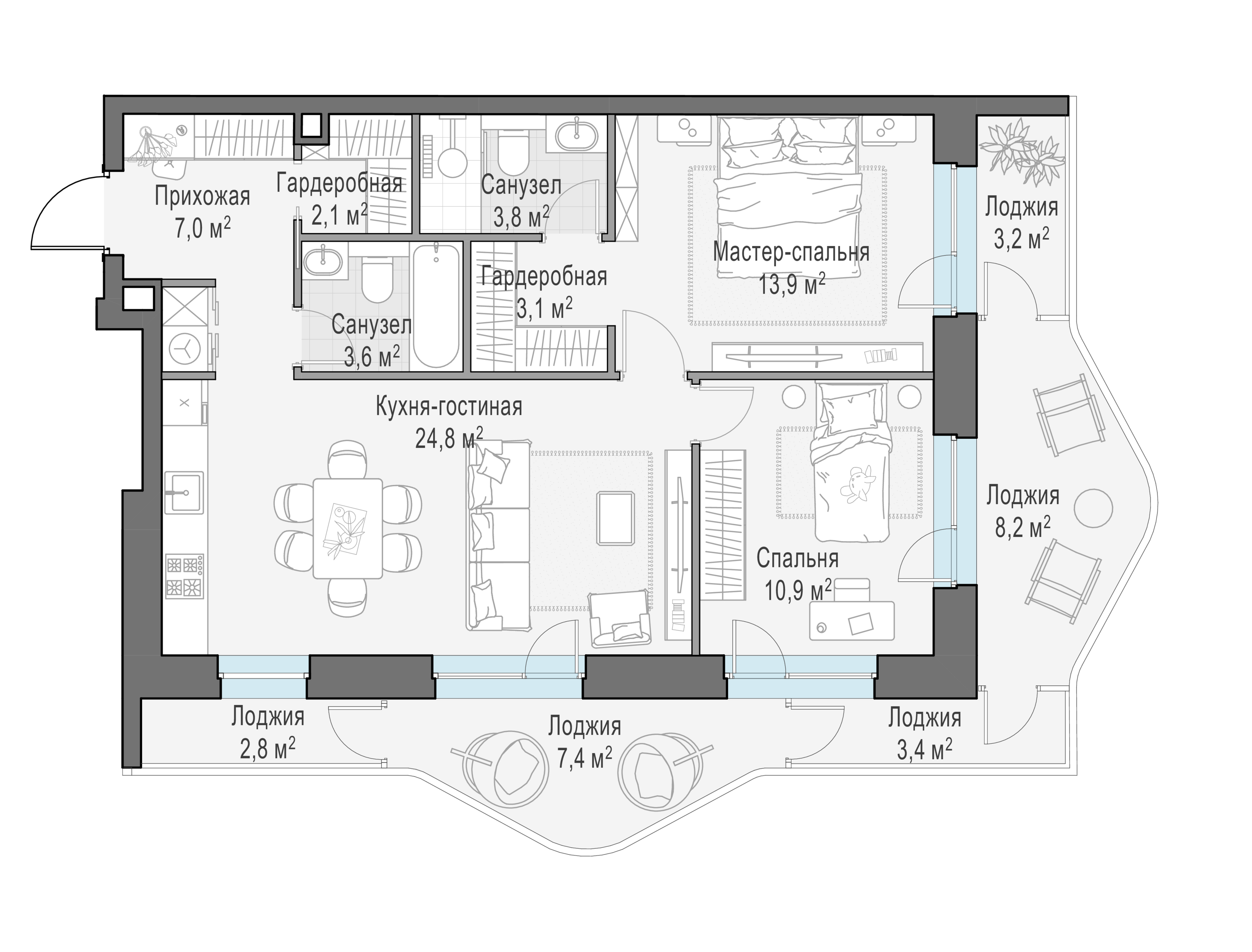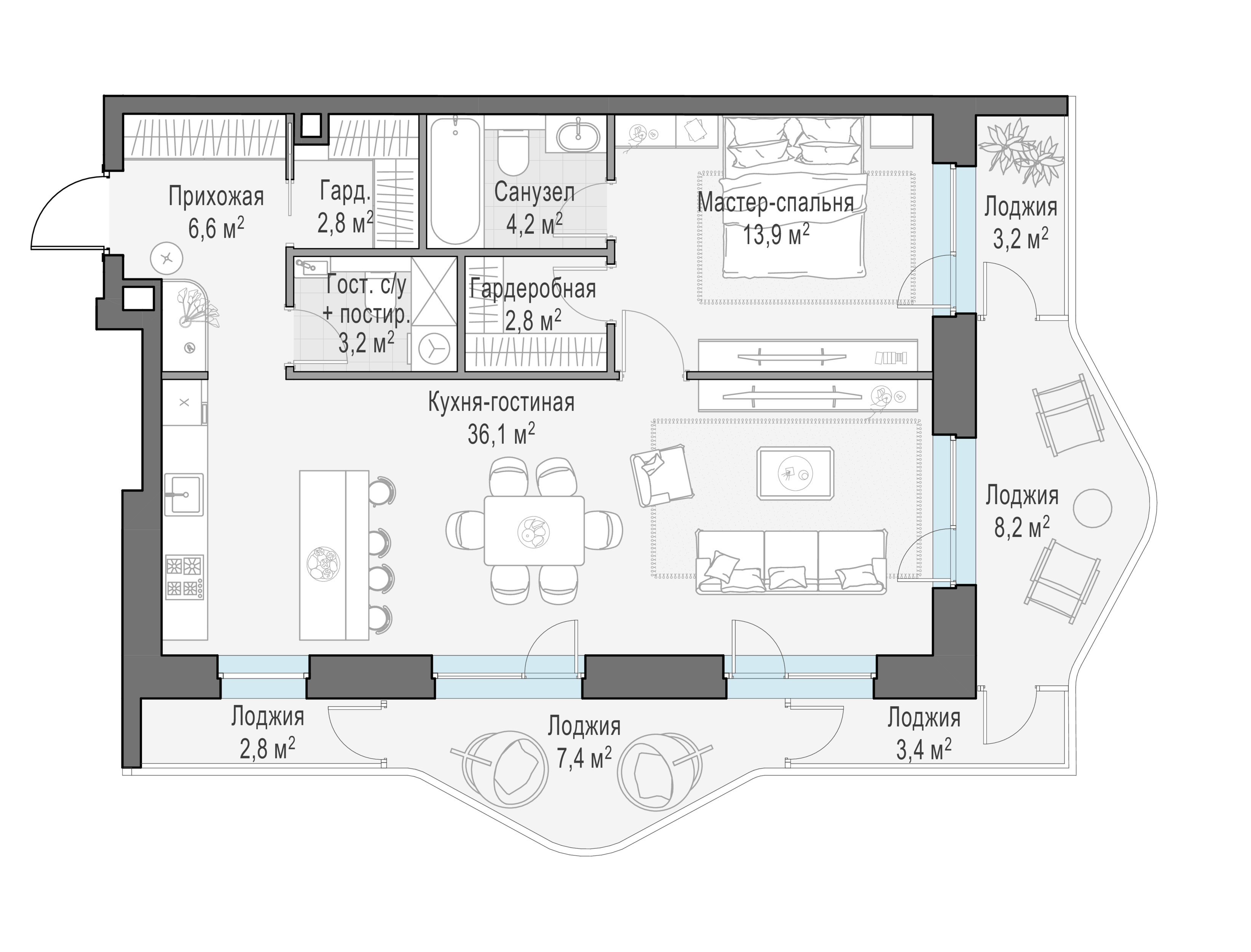 На первых этажах комплекса расположены кафе, магазины, фитнес-студия и другие сервисные объекты. Двухуровневый подземный паркинг с возможностью выбора стандартных, увеличенных или семейных мест. Для удобства жителей предусмотрены лапомойки, келлеры, места для временного хранения велосипедов и самокатов.