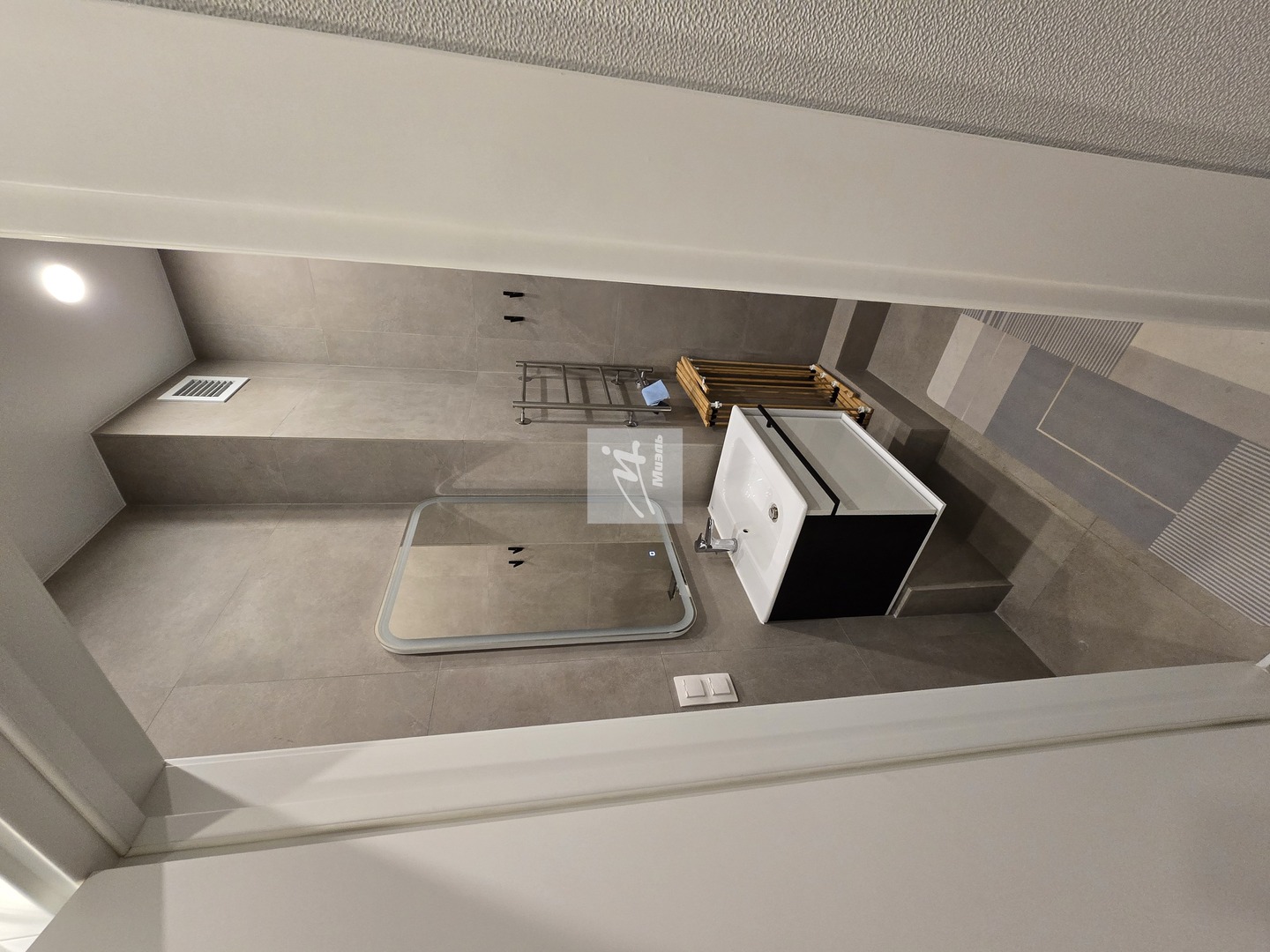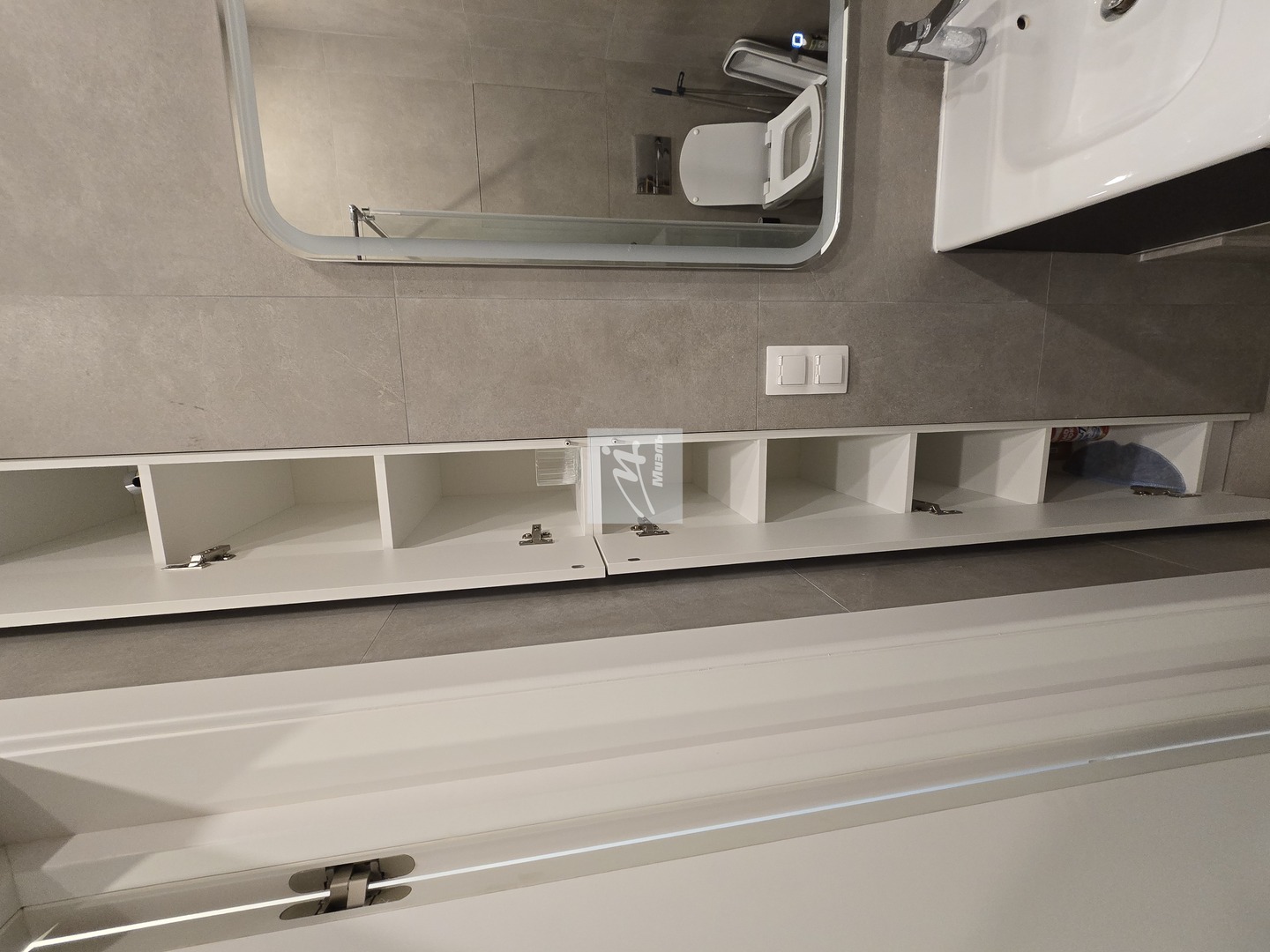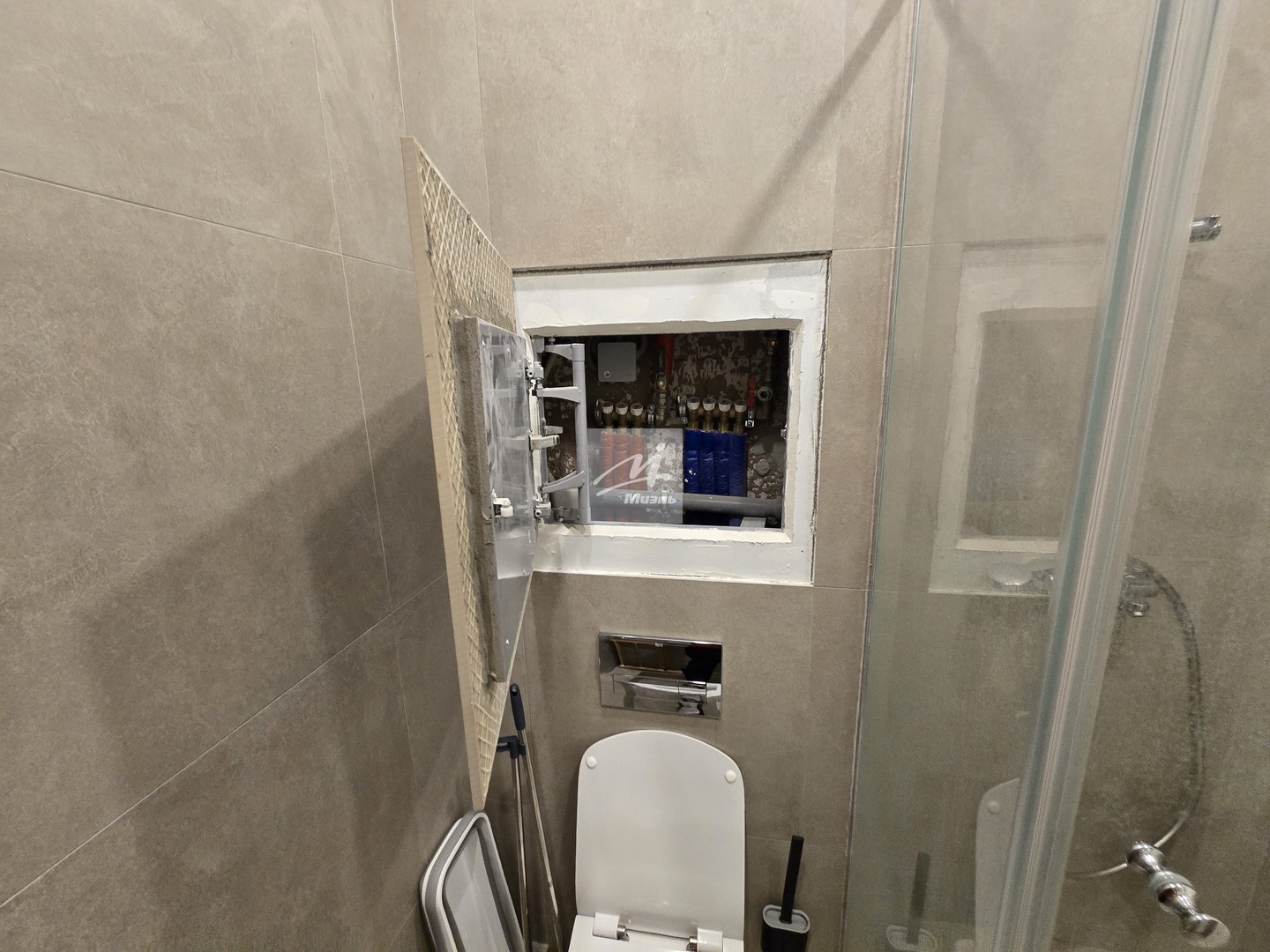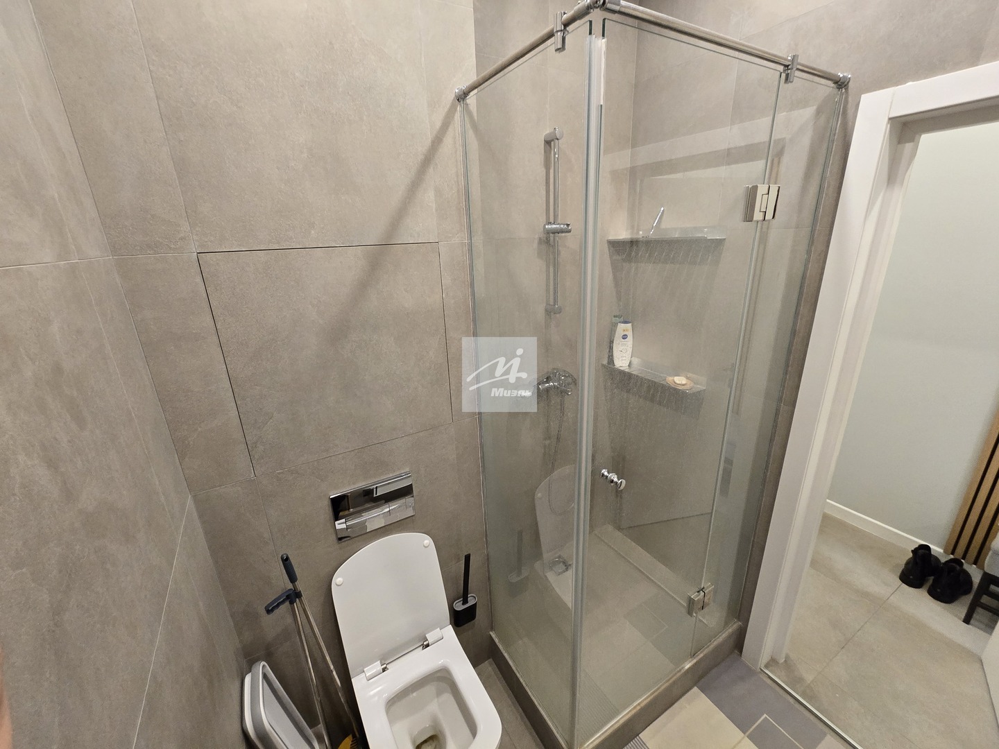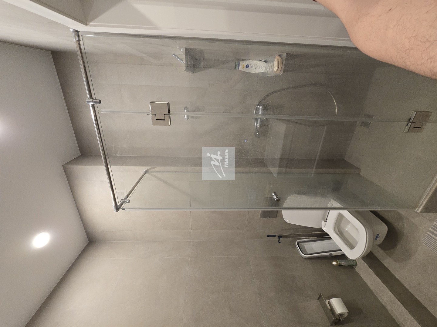 Ванная комната совмещённая, оснащена современной сантехникой, зеркалом с подсветкой, душевой кабиной и встроенным пеналом до потолка для удобного хранения.