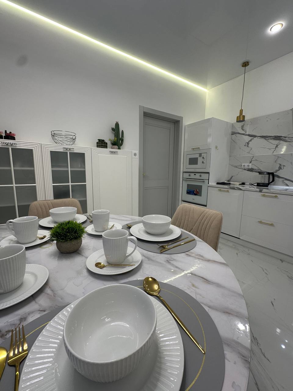 современный двухспальный мягкий диван, вместительные шкафы, обеденный стол на 4 персоны, мягкие стулья, современный дизайнерский кухонный гарнитур со всей встроенной техникой, стильное освещение и интерьерные детали, создающие атмосферу уюта.