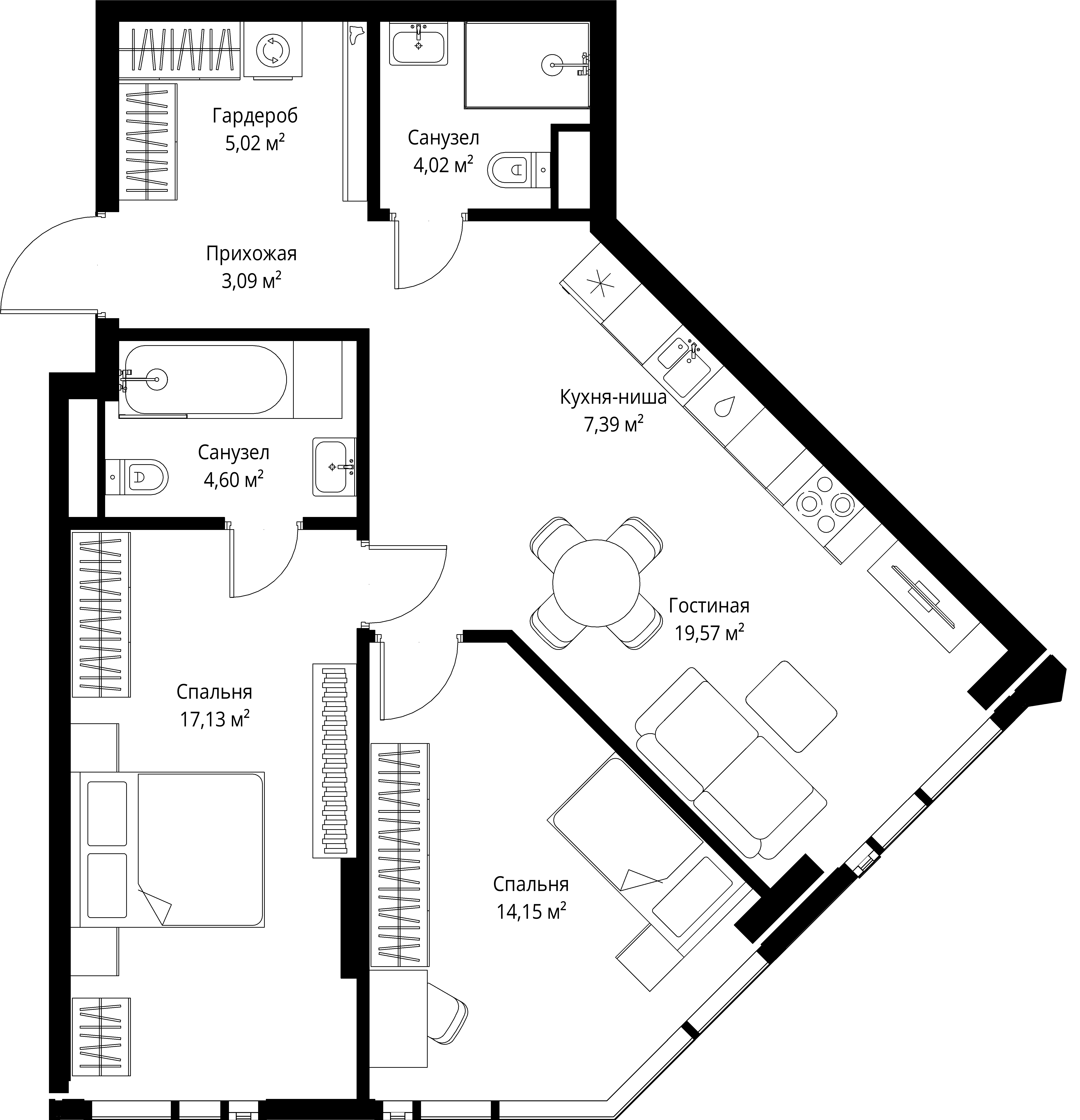 Раздельных санузлов - 1, совмещенных санузлов - 1. Премиальная сантехника.