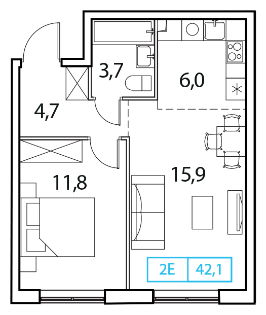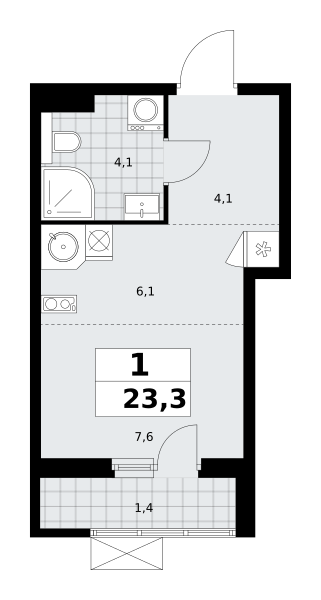 1-комн. квартира-студия от застройщика в ЖК "Бунинские кварталы" на 8 этаже. Квартира без отделки, после оформления собственности можно делать ремонт. Общая площадь: 22.7 кв.м., площадь гостиной 12.9 кв.м., из которых 5.6 кв.м. выделено под кухонную зону. Все окна выходят на одну сторону. В квартире один балкон, один совмещенный санузел. Высота потолков 2.8 м.