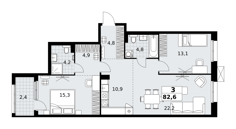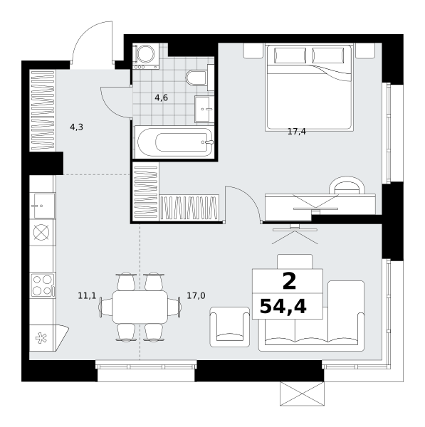 Просторная 2-комн. квартира с отделкой в ЖК "Прокшино" на 14 этаже. Общая площадь: 64 кв.м., жилая: 24.7 кв.м., площадь просторной кухни-столовой: 20.3 кв.м. Угловая квартира, очень светлая, естественная вентиляция при открытии окон. В квартире одна лоджия, один совмещенный и один раздельный санузел. Высота потолков 2.95 м.