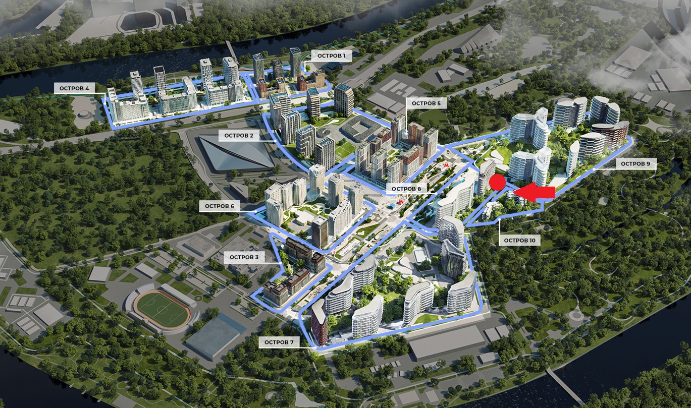 Дом входит в состав ЖК «ОСТРОВ» в окружении спортивного кластера: спортивный комплекс ЦСКА, легкоатлетический манеж, Ледовый дворец Т.Навки. В проект застройки территории входят Академия хоккея А.Овечкина, новое здание Московского цирка.