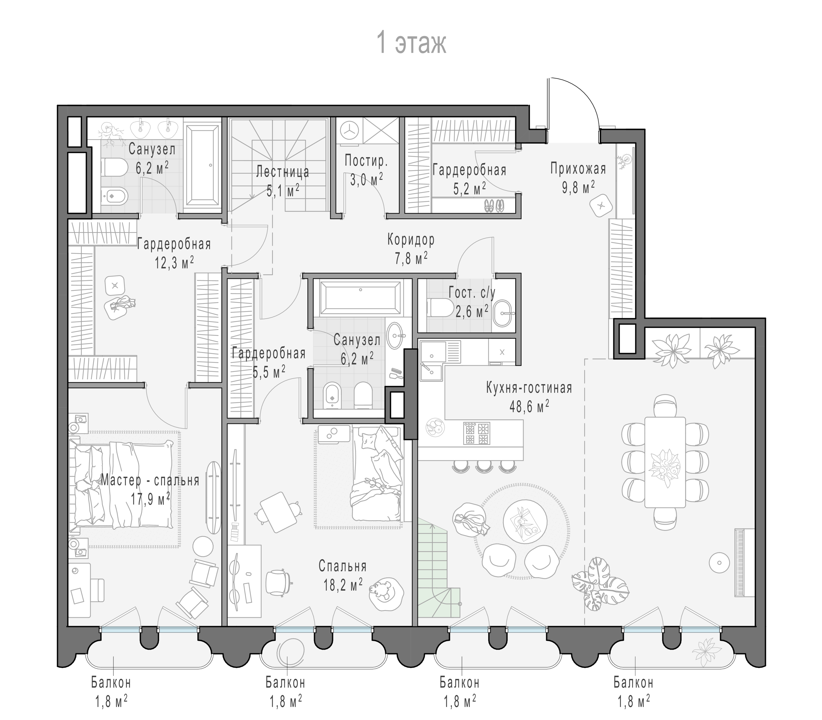 Просторная квартира с тремя мастер-спальнями и панорамными окнами на три стороны света, с которых откроются виды на цветущий сад и витражный парк с соснами.