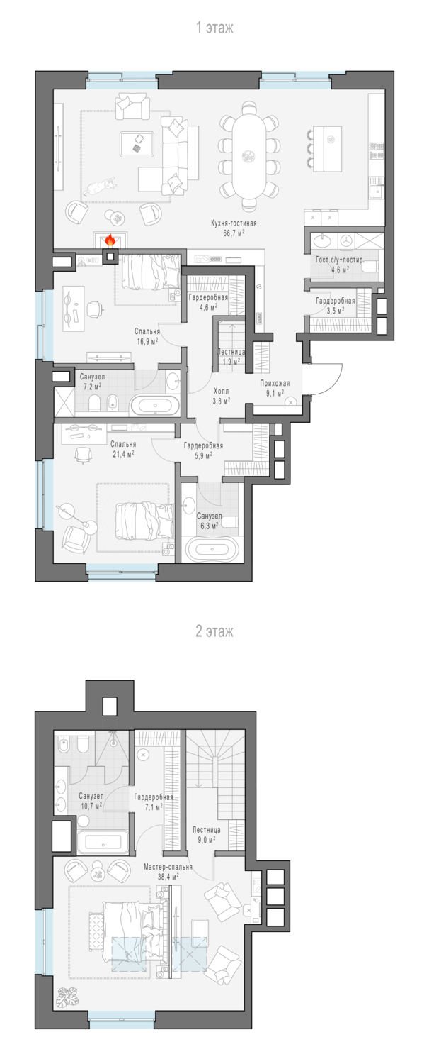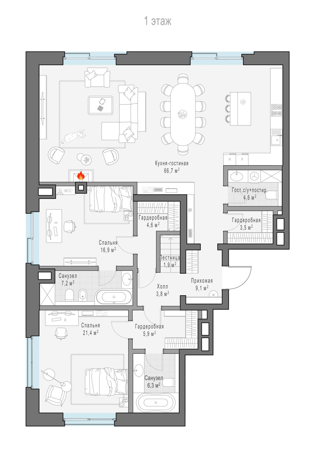 Просторная квартира с четырьмя мастер-спальнями и панорамными окнами на 3 стороны света. С балконов откроются виды на цветущий сад и витражный парк с соснами.