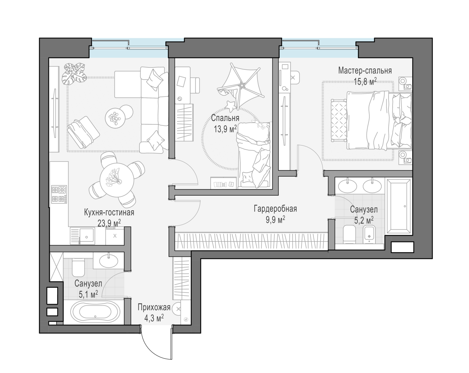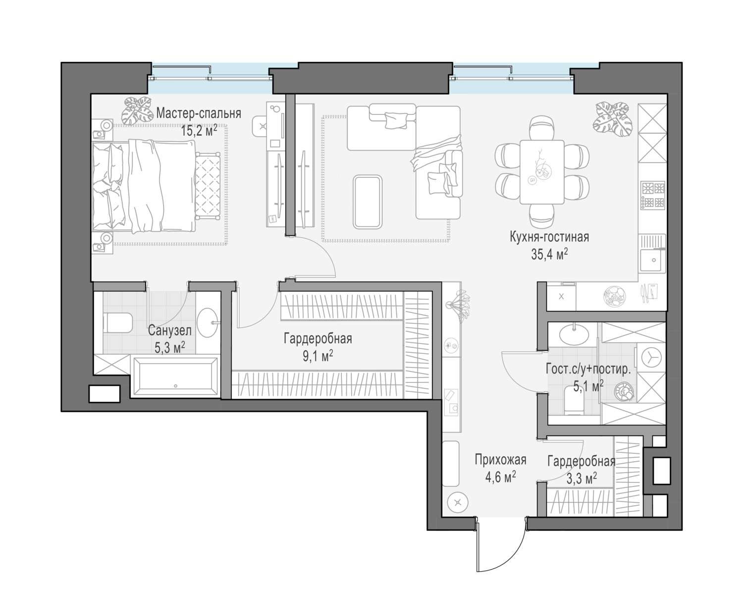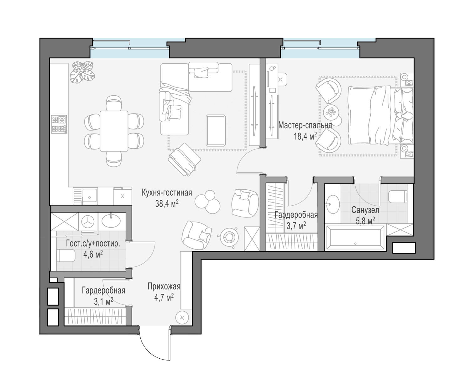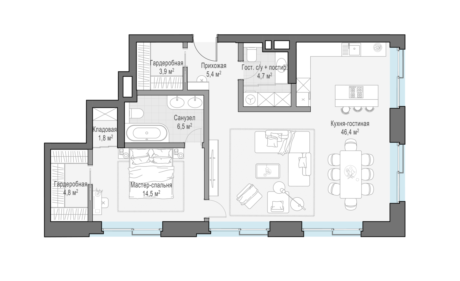 Роскошная односпальная квартира с просторной кухней-гостиной и комфортабельной приватной зоной.