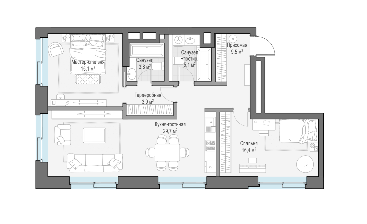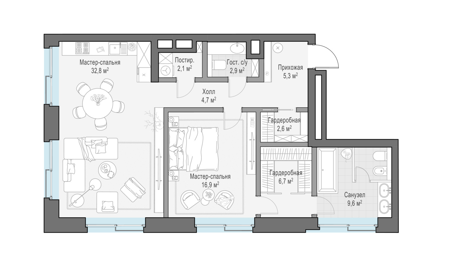 Просторная квартира с одной спальной комнатой. Приватная зона оснащена вместительной гардеробной и просторной ванной комнатой, а площадь кухни-гостиной позволит с комфортом принять гостей.