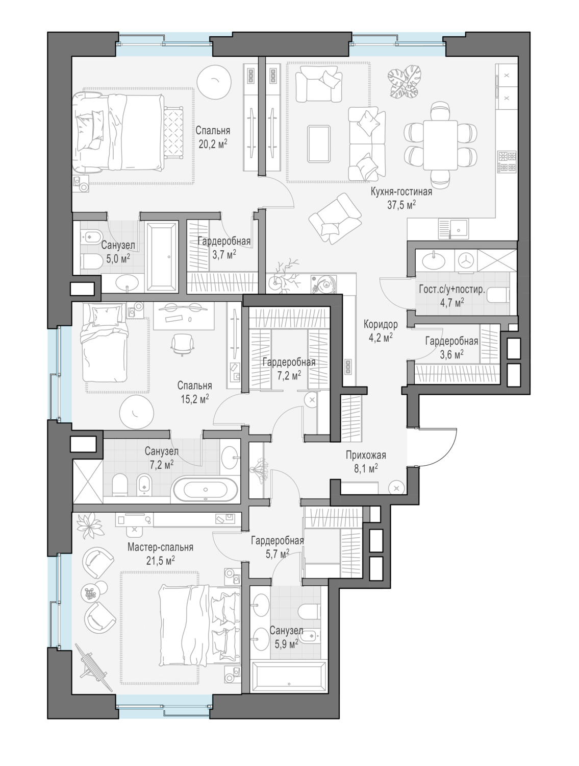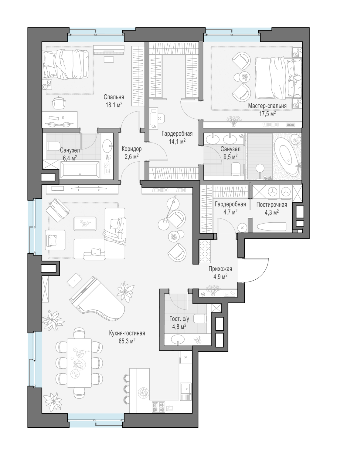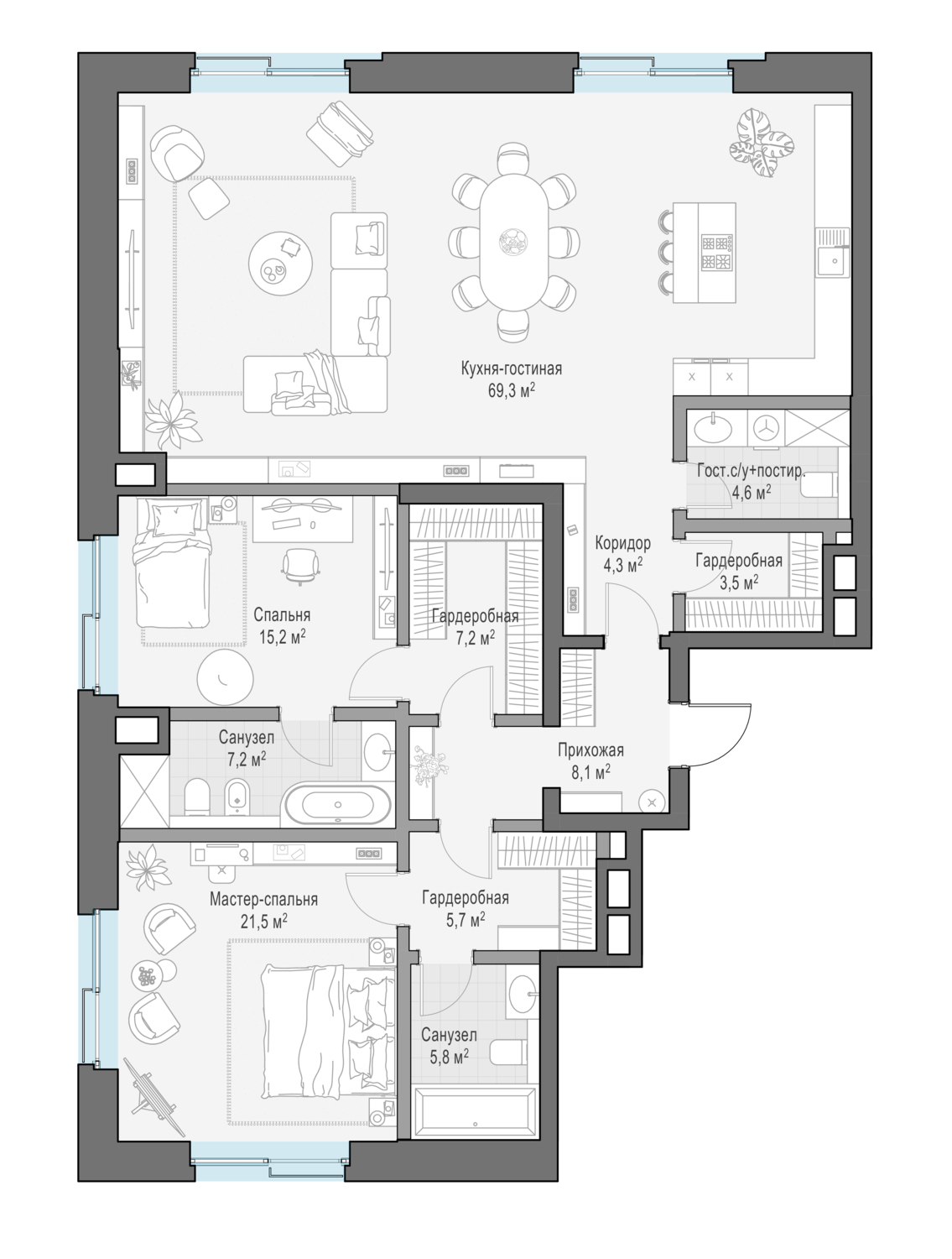 Просторная квартира с особой геометрией кухни-гостиной, двумя мастер-спальнями и балконом впечатляющей площади.