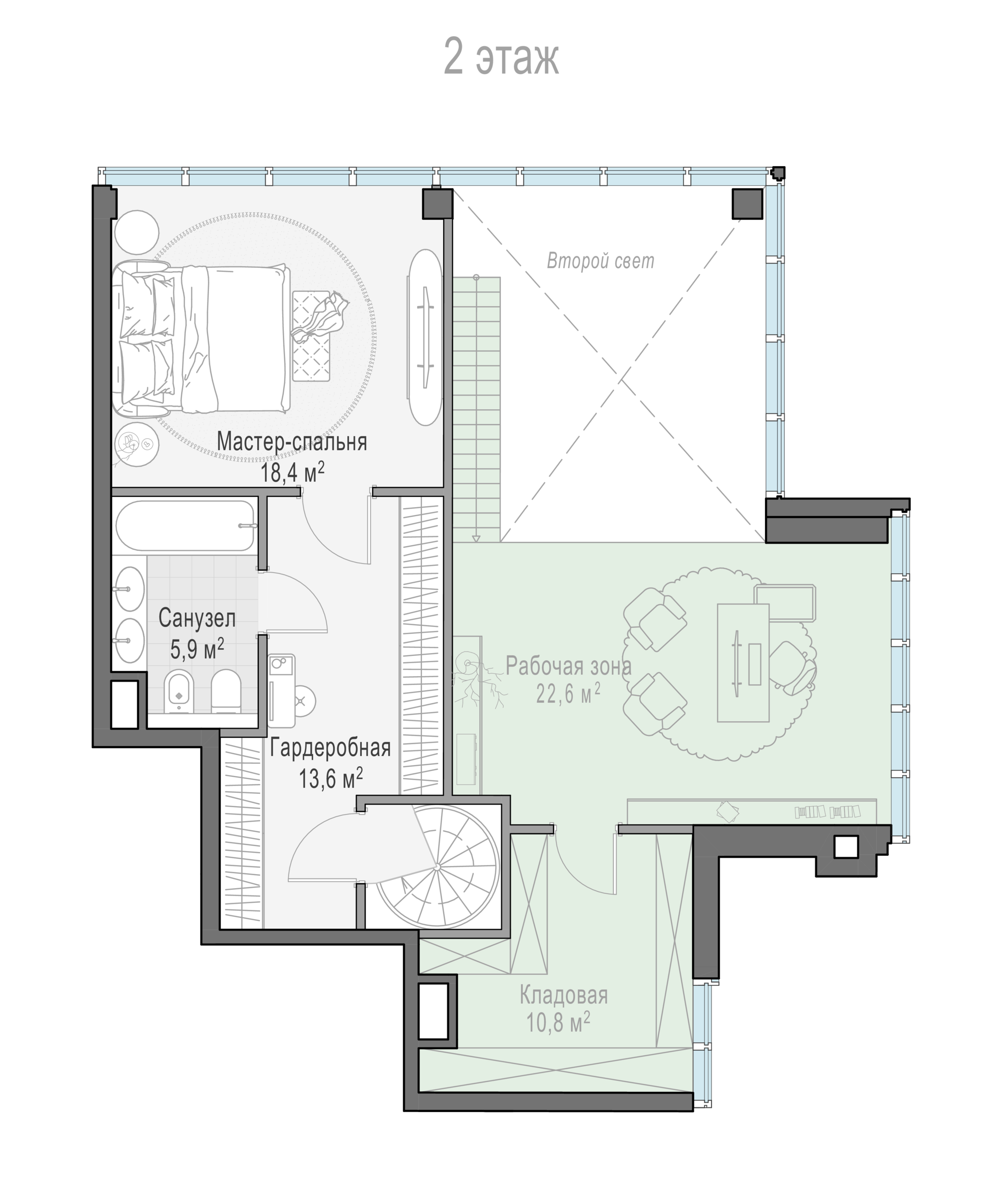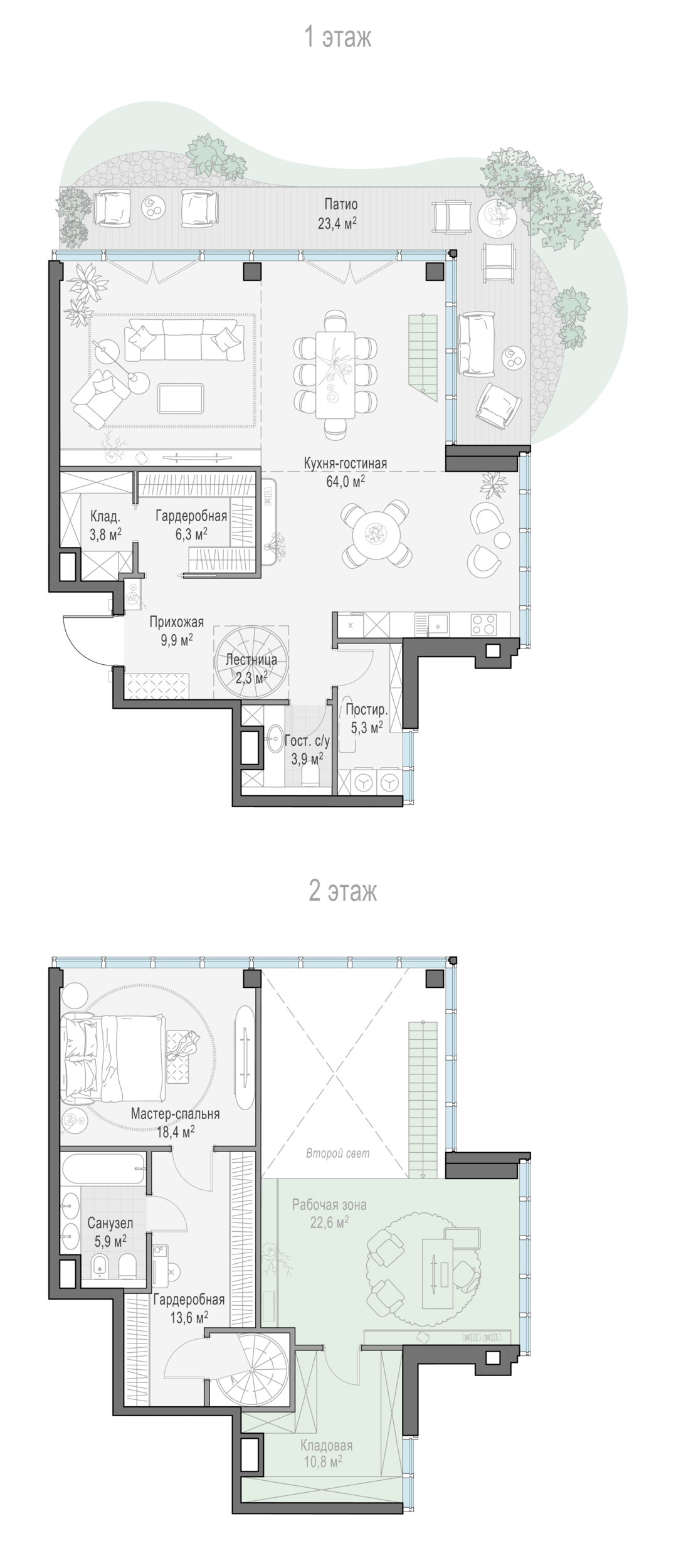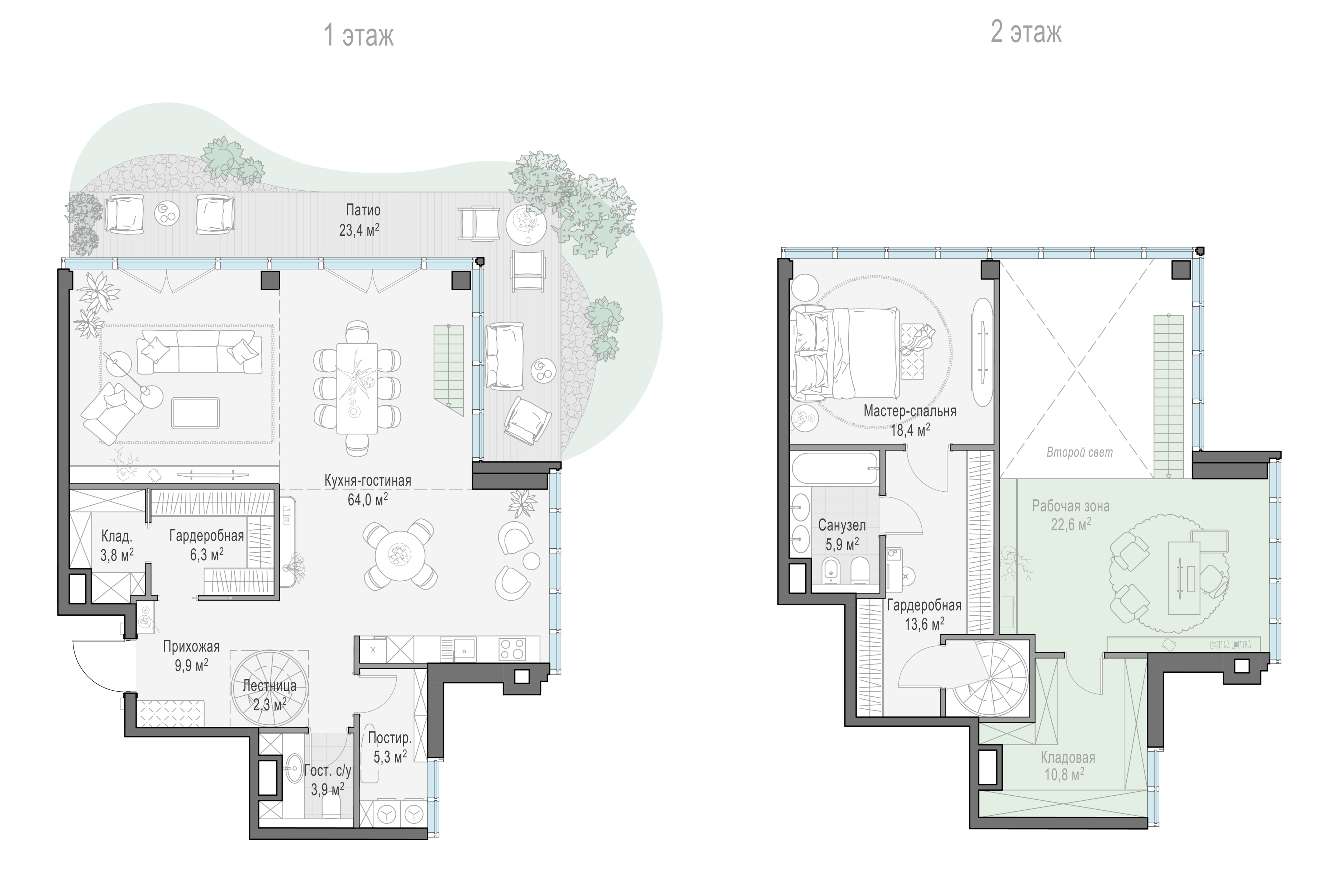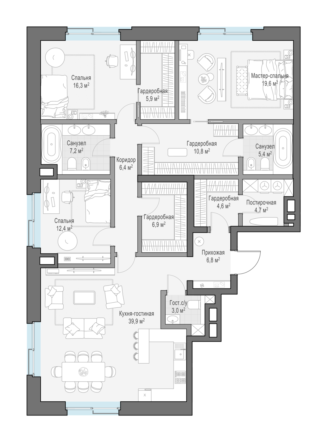 Просторная квартира с особой геометрией кухни-гостиной, двумя мастер-спальнями и балконом впечатляющей площади.