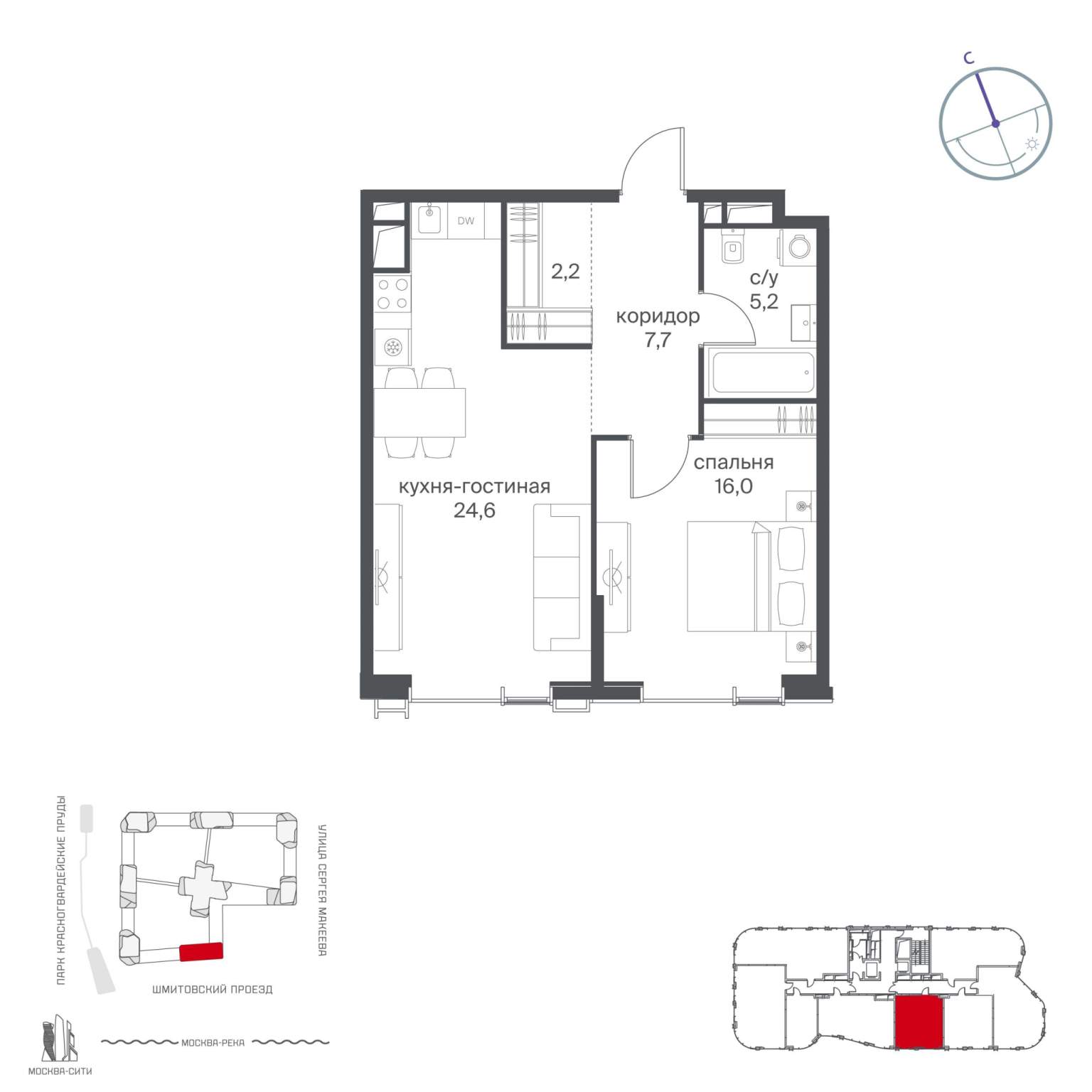 Светлая квартира площадью 55,5 кв. м с окнами на северной и восточной сторонах. Продуманная планировка позволяет разместить отдельную спальню с санузлом и гардеробной.