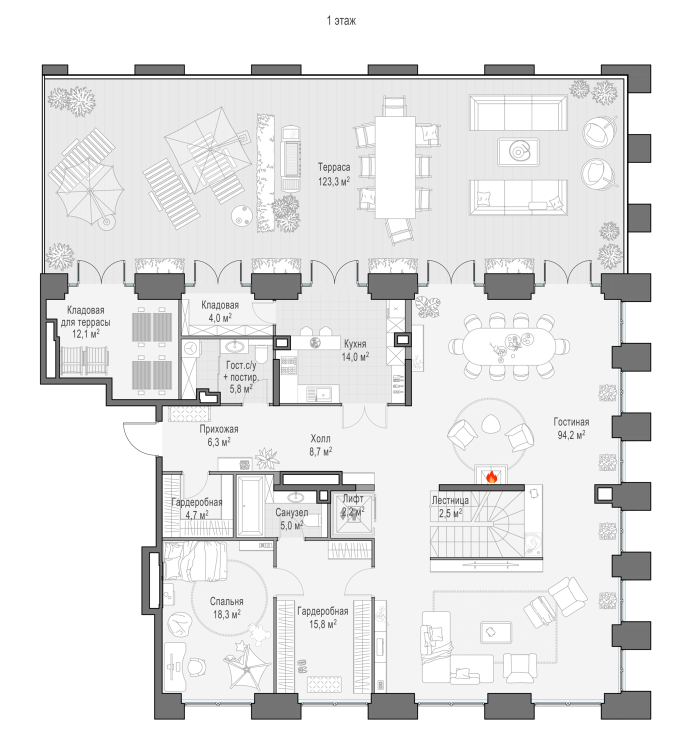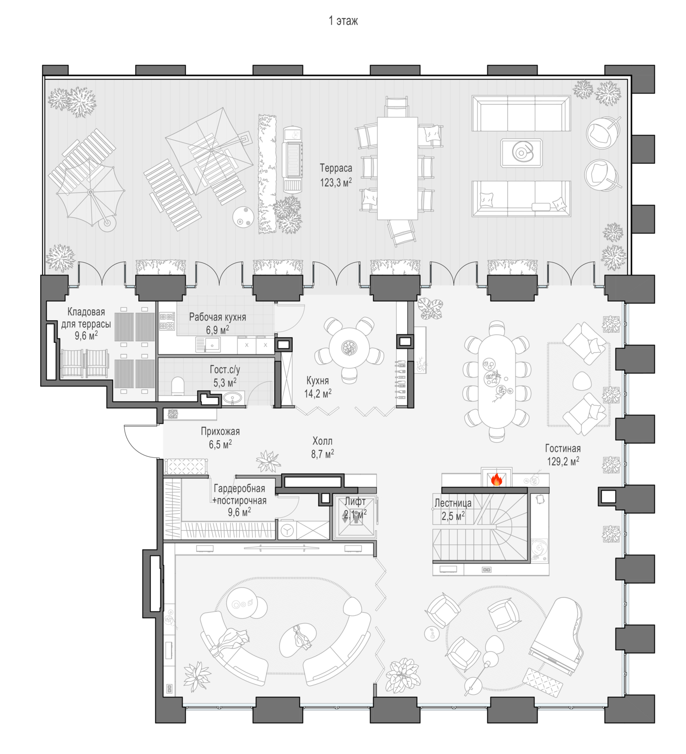 • Кухня-гостиная с выходом на террасу 123 м2.