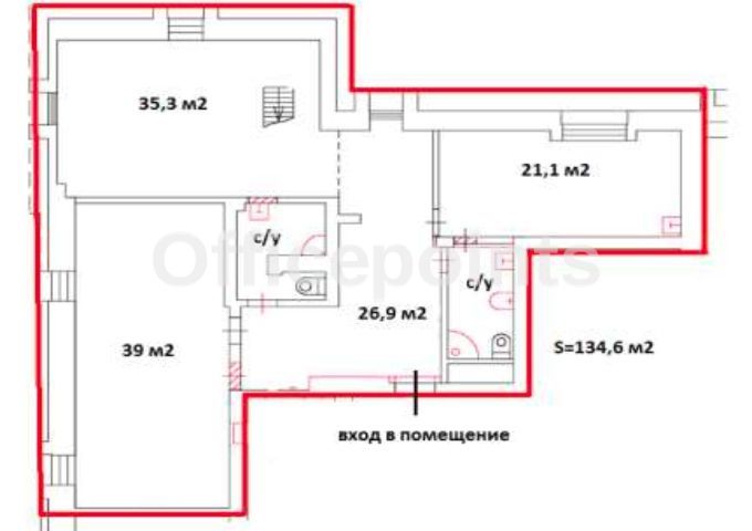 – Помещение без отделки, кабинетная планировка (4 кабинета, 2 с/у).