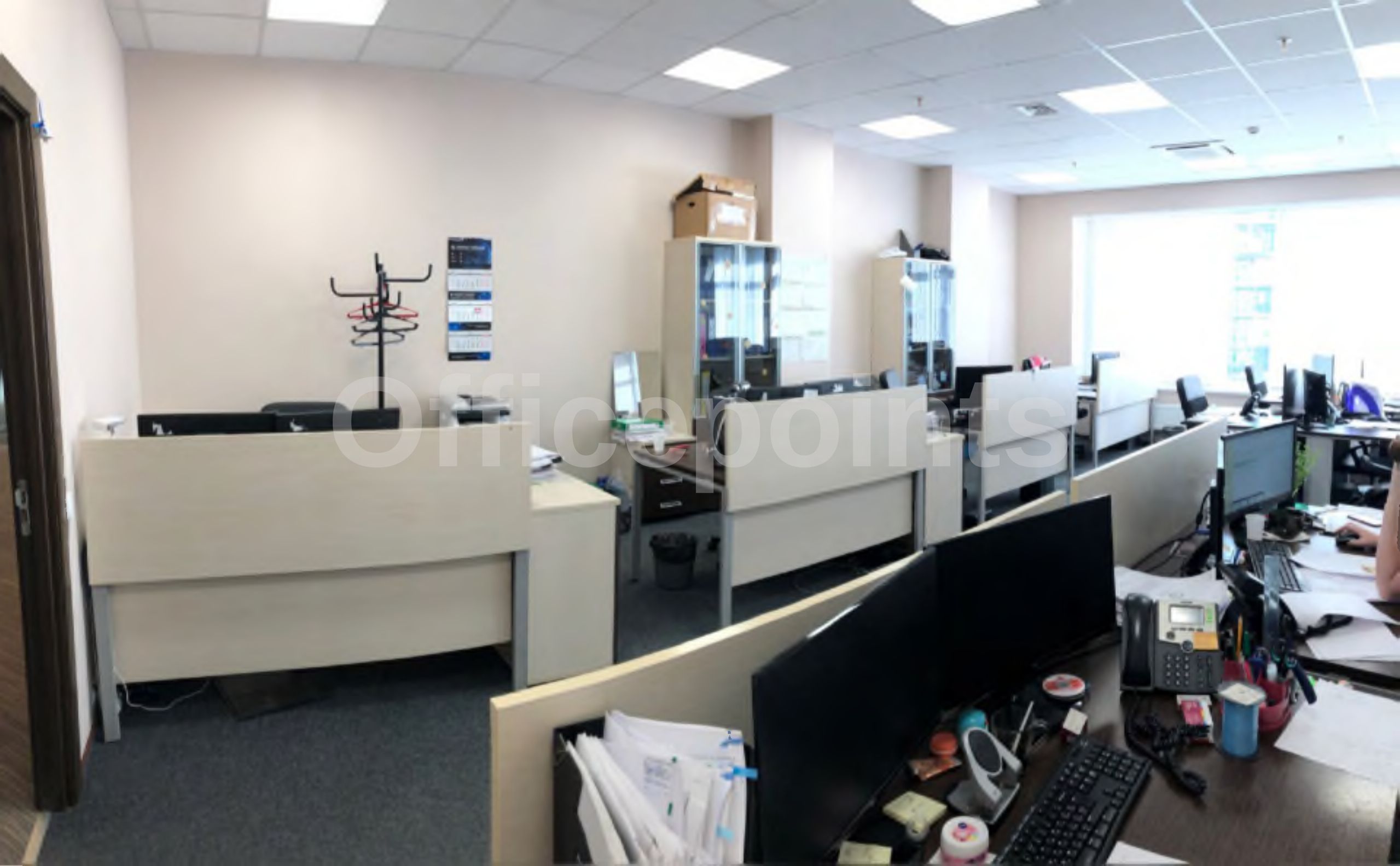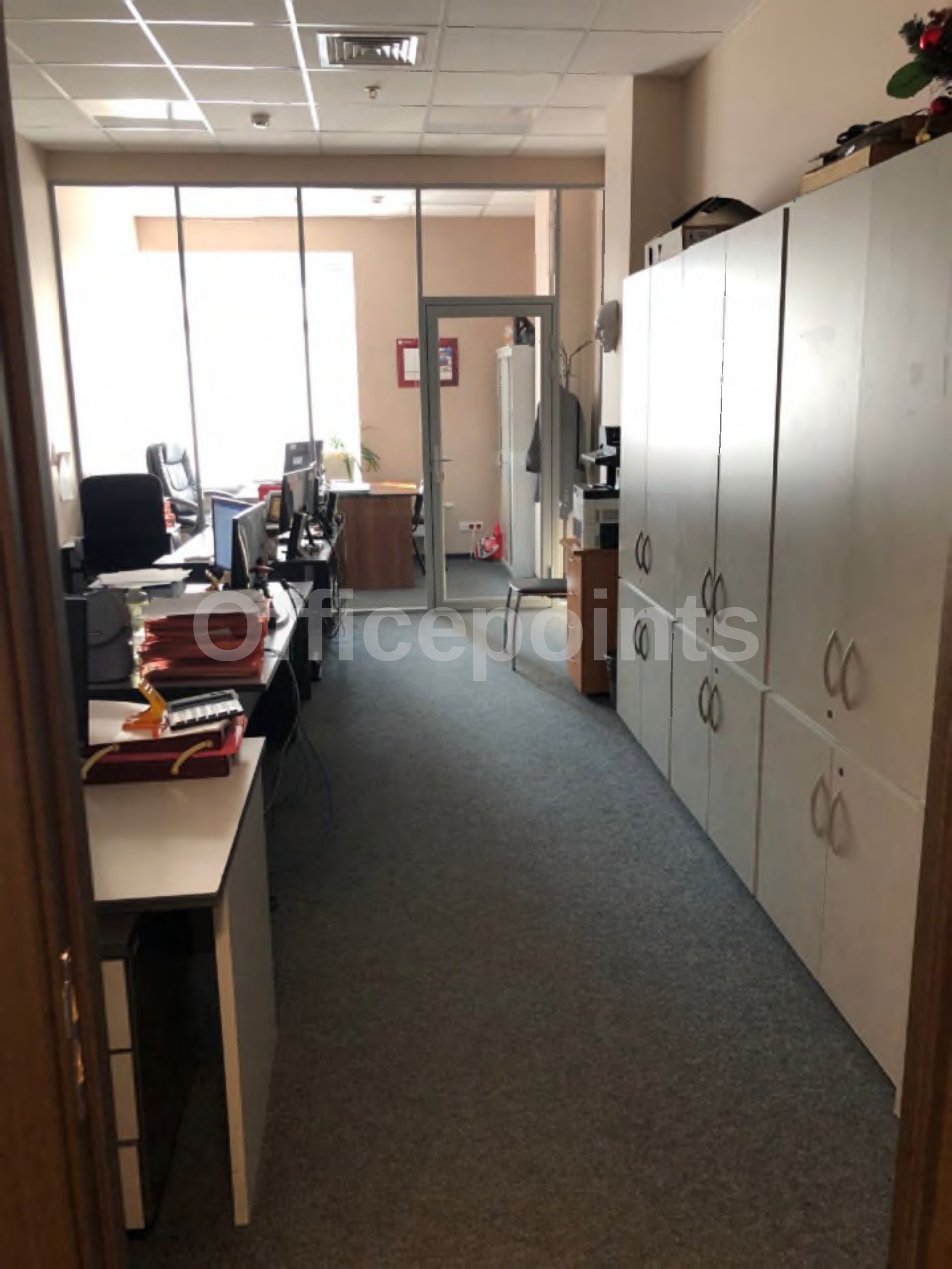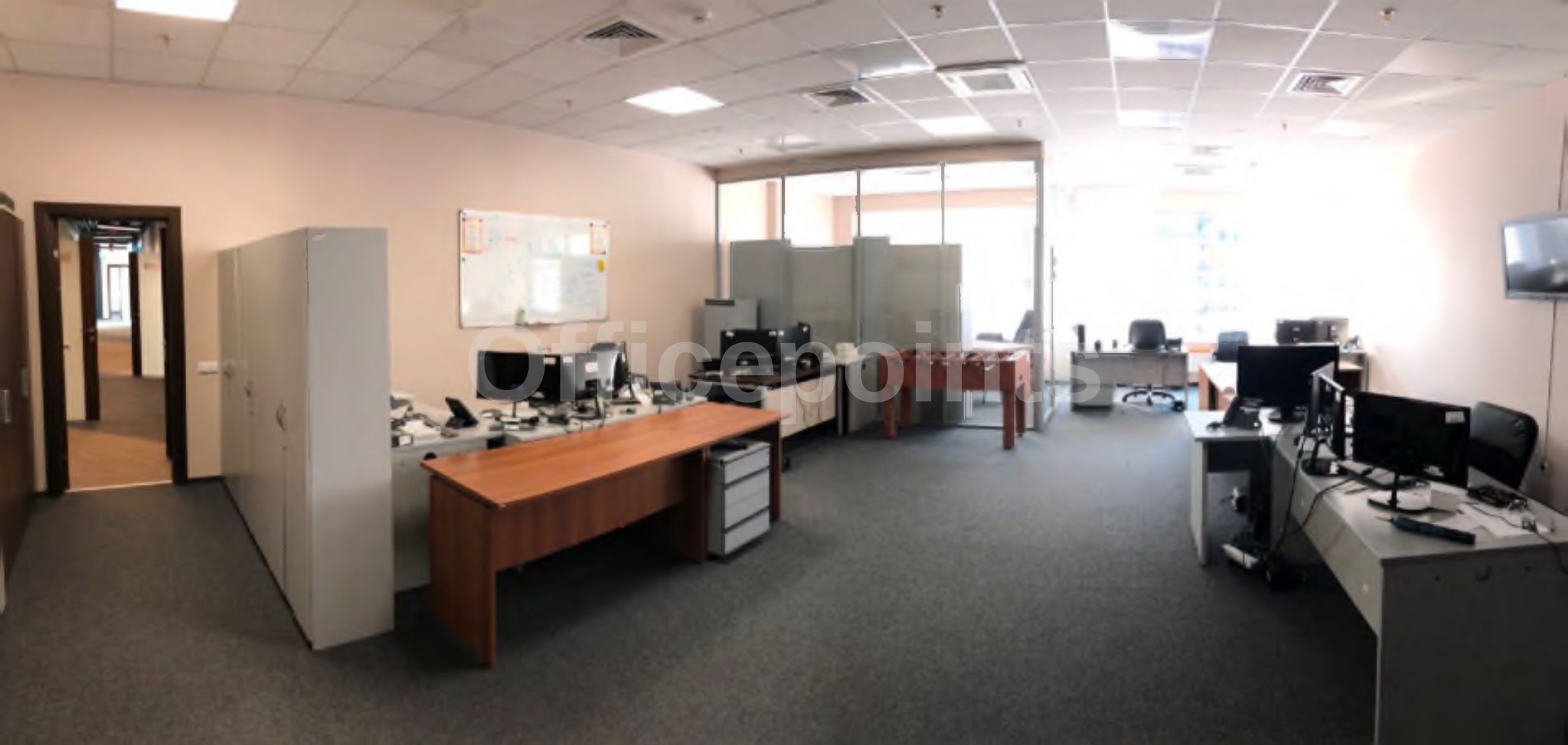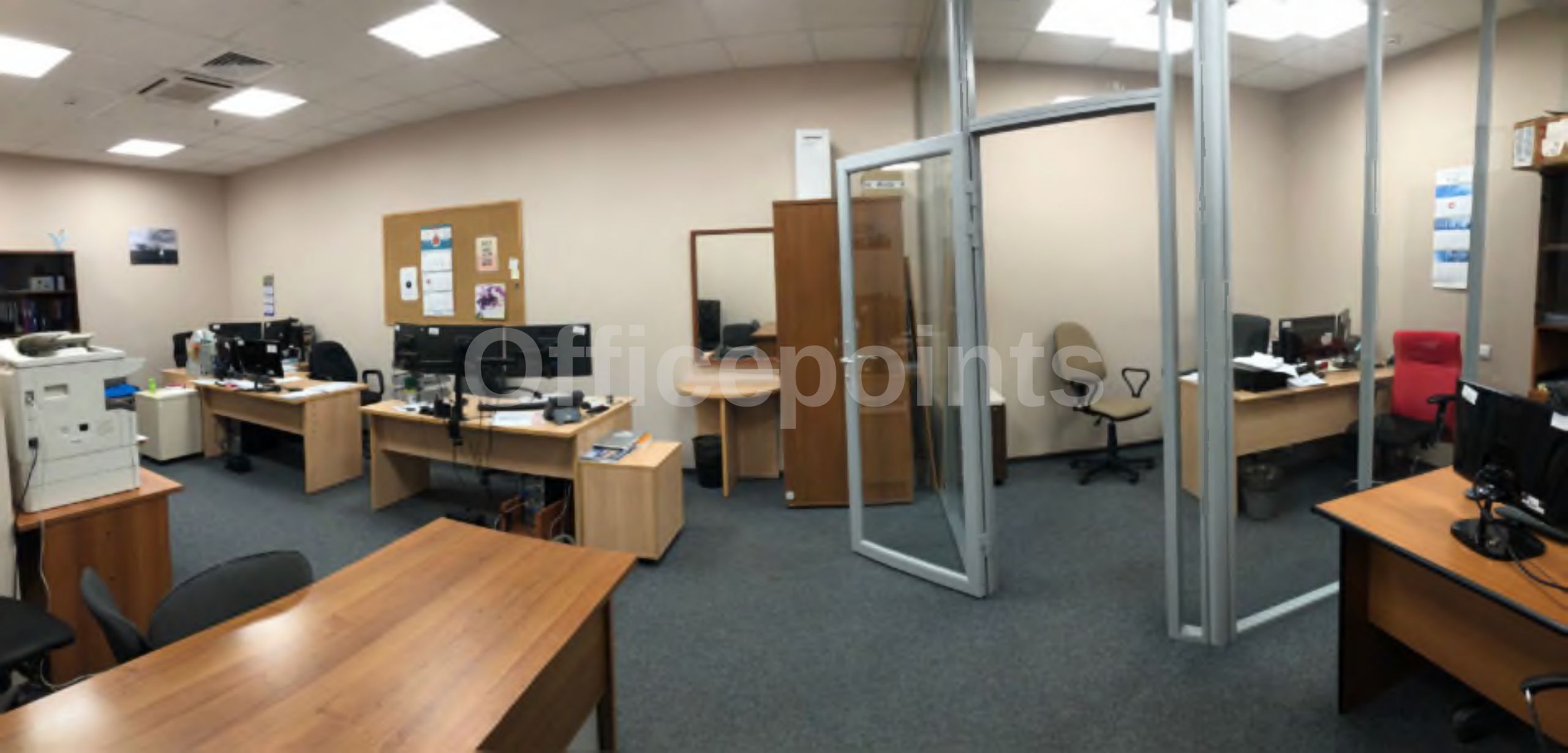 – В помещении стандартная офисная отделка, смешанная планировка.
