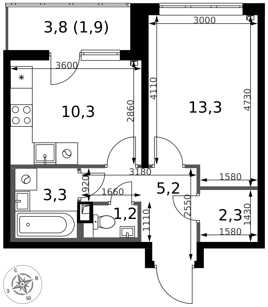 Евродвушка, кухня совмещенная с гостинной, утепленная лоджия с освещением, два сан узла