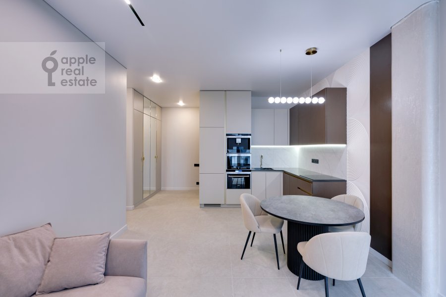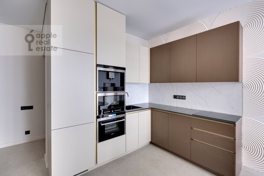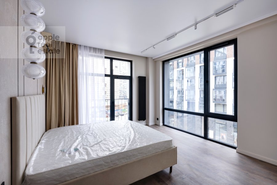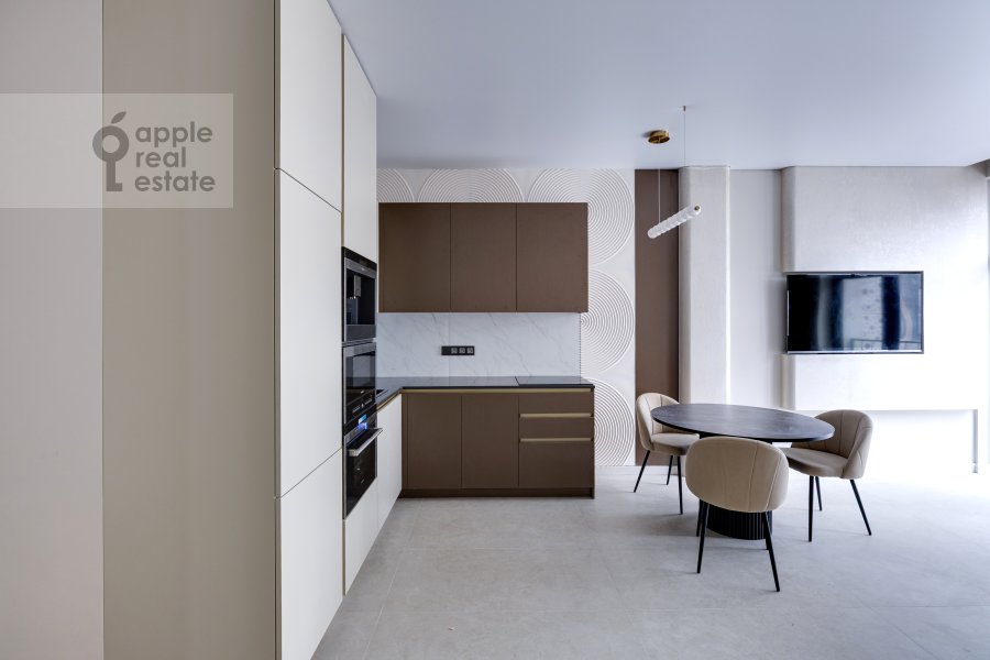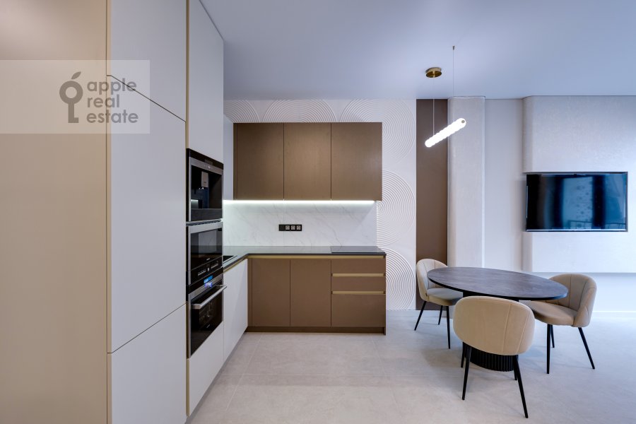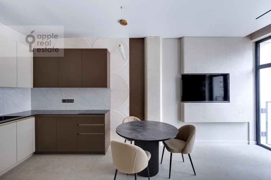 кухня-гостиная с обеденным столом и стульями, уютный диван и большой телевизор, есть необходимая техника: варочная панель, духовой шкаф, микроволновая печь, посудомойка, встроенная кофемашина (всё марки «Siemens»). Спальня, мастер-спальня (с/у с ванной) с гардеробной комнатой. С/у с душевой кабиной (там же стиральная и сушильная машины), изюминка – панорамное окно с отдельно стоящей ванной рядом. Есть гардеробная комната.