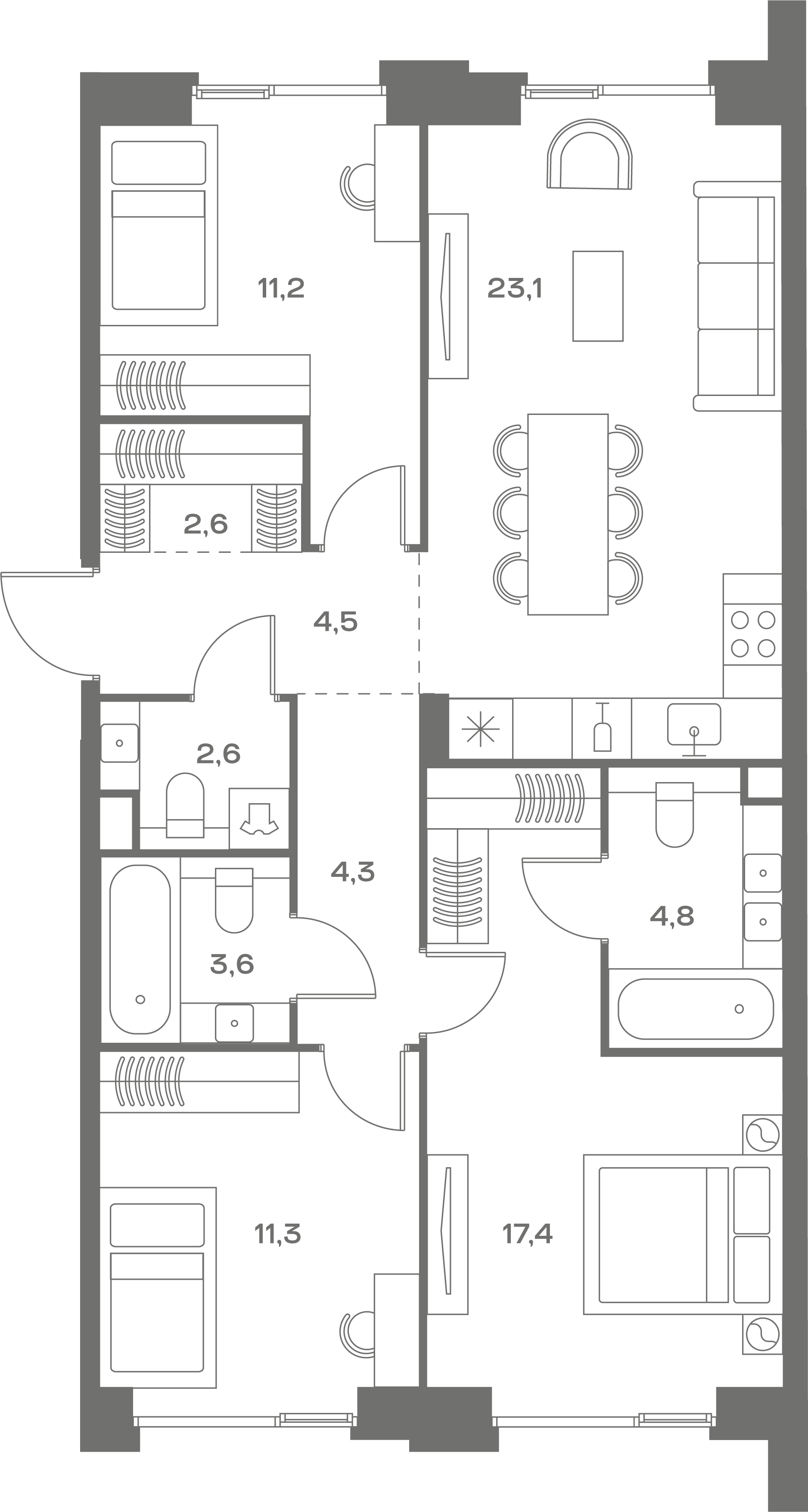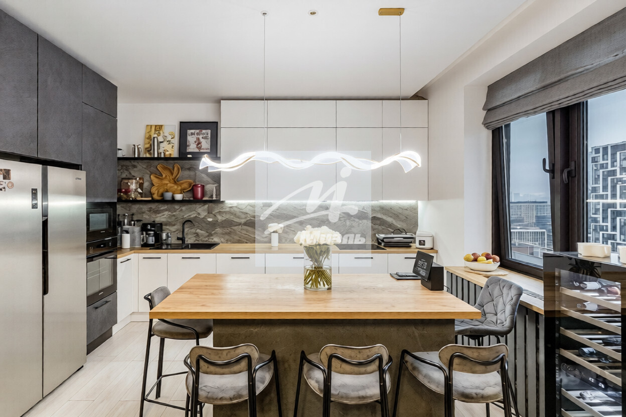 Квартиры с панорамными окнами, мастер-спальнями, гардеробными, классическими балконами и лоджиями, видовыми террасами. Высота потолков от 2,9 до 3,5 м.