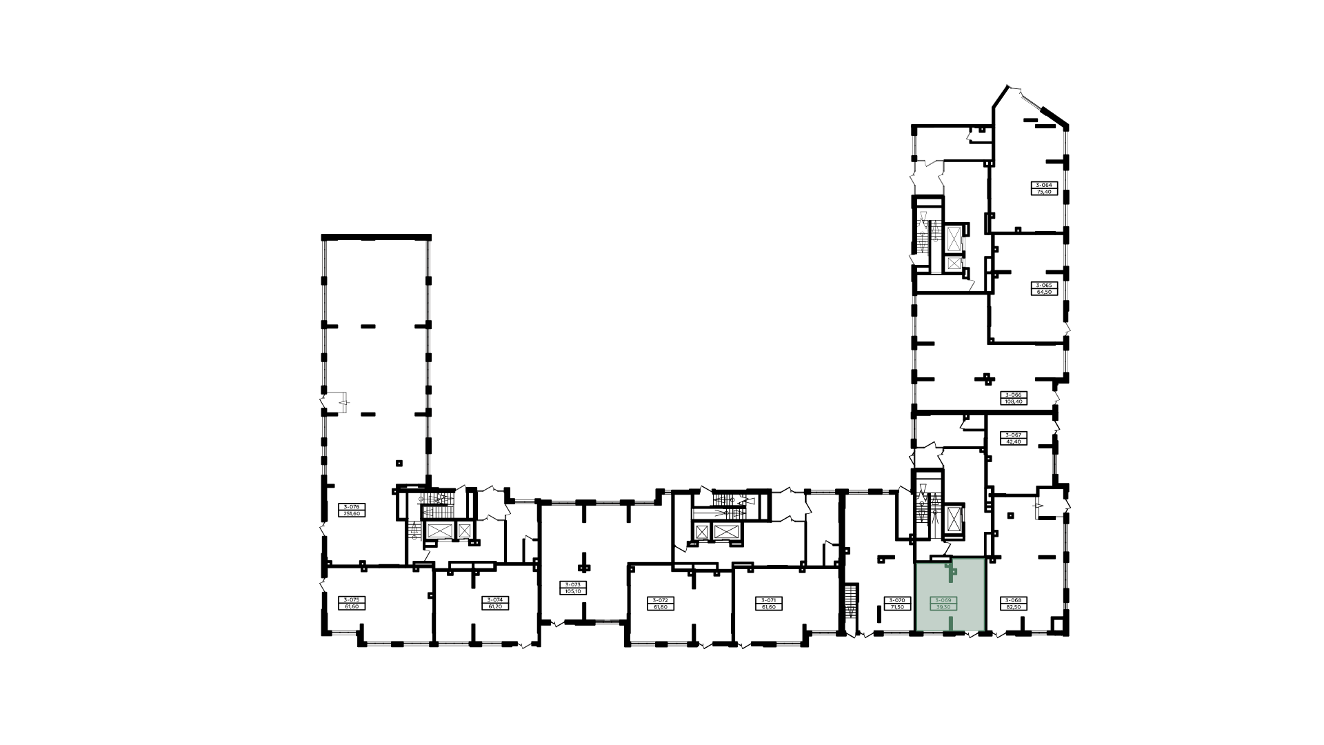 Площадь 19,1 кв.м (на плане - Блок № 3), планировка открытая, высота потолка 3,6 м, центральный коммуникации, витринное остекление по фасаду.