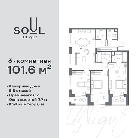 Купить 3к квартиру 101 м² в ЖК Soul (Соул)