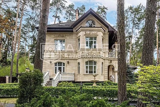 Цокольный этаж строился по немецкой технологии гидроизоляции подвальных помещений, с использованием топовых материалов гидроизоляции как в основании, так и во всех стенах цоколя, с дополнительным дренажом по периметру дома на глубине 6 метров. Фасад дома выполнен частично из итальянского мрамора, керамогранита.